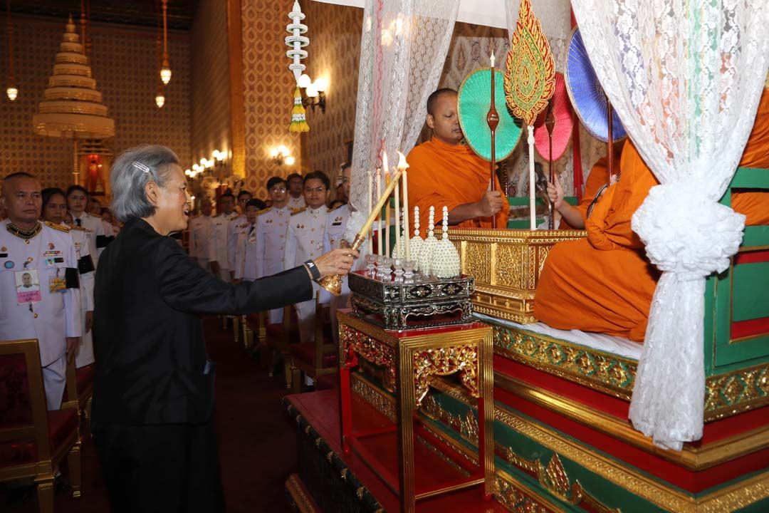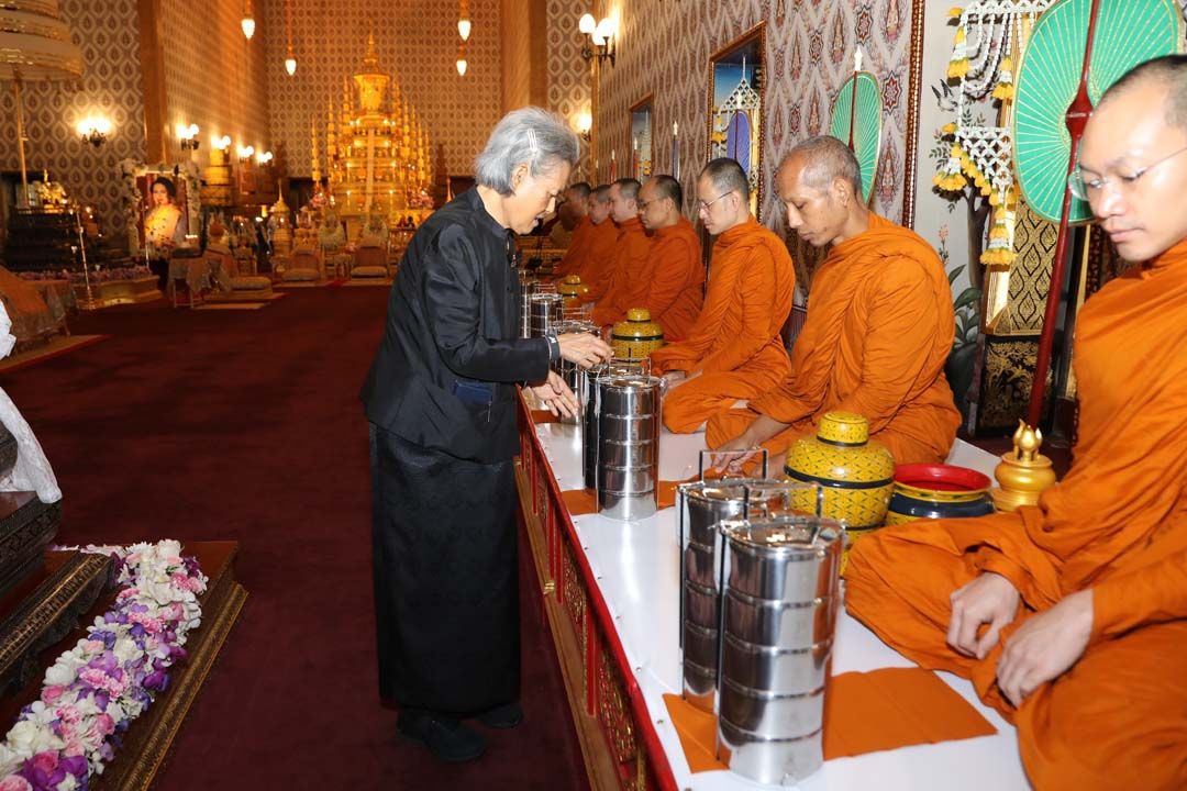 ในการนี้ ทรงประเคนภัตตาหารเช้า แด่พระพิธีธรรม ที่สวดพระอภิธรรมพระบรมศพสมเด็จพระนางเจ้าสิริกิติ์ พระบรมราชินีนาถ พระบรมราชชนนีพันปีหลวง ซึ่งเป็นพระพิธีธรรม จากวัดมหาธาตุยุวราช รังสฤษฎิ์ และวัดบวรนิเวศวิหาร รวม 8 รูป