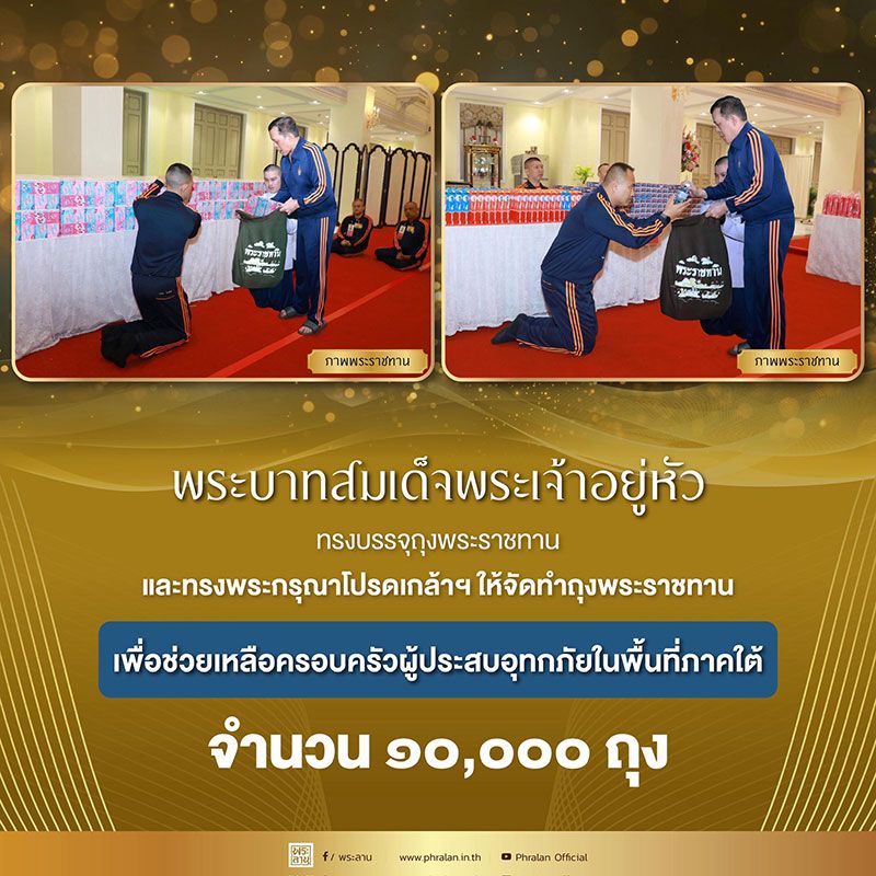โดยระบุข้อความว่า ด้วยน้ำพระราชหฤทัยอันงดงาม พระบาทสมเด็จพระเจ้าอยู่หัว ทรงบรรจุถุงพระราชทาน และทรงพระกรุณาโปรดเกล้าฯให้จัดทำถุงพระราชทานเพื่อช่วยเหลือครอบครัวผู้ประสบอุทกภัยในพื้นที่ภาคใต้ จำนวน 10,000 ถุง