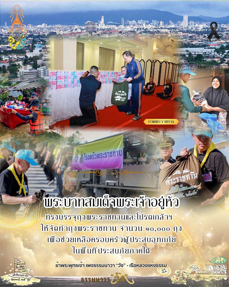วันที่ 29 พฤศจิกายน 2568 เพจเฟซบุ๊ก "ธรรมนาวา วัง – เรือหลวงแห่งธรรม" เผยแพร่พระบรมฉายาลักษณ์ พระบาทสมเด็จพระเจ้าอยู่หัว ทรงบรรจุถุงพระราชทานเพื่อพระราชทานแก่พสกนิกรที่ประสบภัยน้ำท่วมภาคใต้