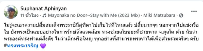 ขณะที่ ดร.ศุภณัฐ อภิญญาณ หรือ “ดร.นิว” นักวิจัยภายใต้สถาบันวิจัย MAST Center และ คณะวิศวกรรมชีวการแพทย์ University of Arkansas ประเทศสหรัฐอเมริกา โพสต์เฟซบุ๊ก Suphanat Aphinyan ก็โพสต์ถึงเรื่องนี้ ซึ่งระบุว่า ไม่รู้จะเอาความปลื้มสมเด็จพระราชินีสุทิดาไปเก็บไว้ที่ไหนแล้ว ปลื้มมากๆๆ นอกจากไปแข่งเรือใบ ยังทรงเป็นแบบอย่างในการรักษ์สิ่งแวดล้อม ทรงช่วยเก็บขยะที่ชายหาด จ.ภูเก็ต ด้วย นับว่าพระองค์ทรงทำแต่สิ่งดีๆ ไม่ว่าเล็กหรือใหญ่ ทุกอย่างที่สามารถทรงทำได้เพื่อส่วนรวมจริงๆ ครับ #ทรงพระเจริญ