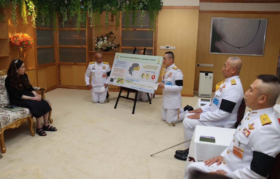 ในโอกาสนี้ กองทัพบกได้กราบทูลถวายรายงานผลการก่อสร้างที่มั่นกำบัง (หลุมบุคคลคู่) สำหรับกำลังพล และหลุมหลบภัยสำหรับประชาชนตามแนวชายแดนไทย-กัมพูชา ซึ่งได้รับการสนับสนุนจาก “กองทุนหทัยทิพย์” รวมจำนวน 51,813,600 บาท โดยแบ่งการดำเนินการเป็นแผนงานระยะที่ 1 และแผนงานระยะที่ 2 ครอบคลุมการก่อสร้างที่มั่นกำบัง 328 แห่ง และหลุมหลบภัยขนาดความจุ 40 คน 10 แห่ง ในพื้นที่จังหวัดสระแก้ว สุรินทร์ อุบลราชธานี ศรีสะเกษ และบุรีรัมย์