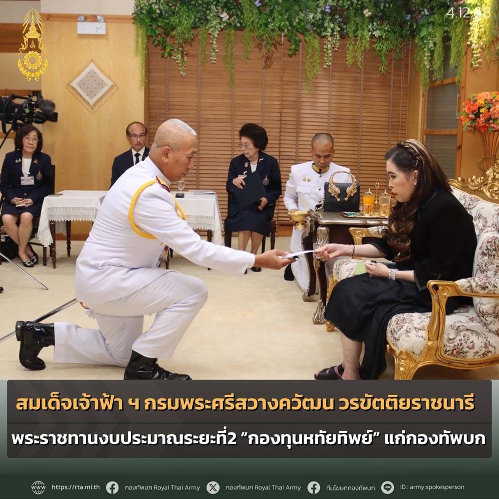 วันนี้ (4 ธันวาคม 2569) เวลา 14.00 น. ศาสตราจารย์ ดร.สมเด็จพระเจ้าน้องนางเธอ เจ้าฟ้าจุฬาภรณวลัยลักษณ์ อัครราชกุมารี กรมพระศรีสวางควัฒน วรขัตติยราชนารี พระราชทานพระวโรกาสให้ พลเอก พนา แคล้วปลอดทุกข์ ผู้บัญชาการทหารบก และคณะ เฝ้า เพื่อรับพระราชทานงบประมาณสำหรับการก่อสร้างที่มั่นกำบังและหลุมหลบภัยตามแผนงานระยะที่ 2 จำนวน 39,253,600 บาท พร้อมถวายรายงานความก้าวหน้าการดำเนินงานโครงการสนับสนุน “กองทุนหทัยทิพย์” กองทัพบก ณ สถาบันวิจัยจุฬาภรณ์ เขตหลักสี่ กรุงเทพมหานคร