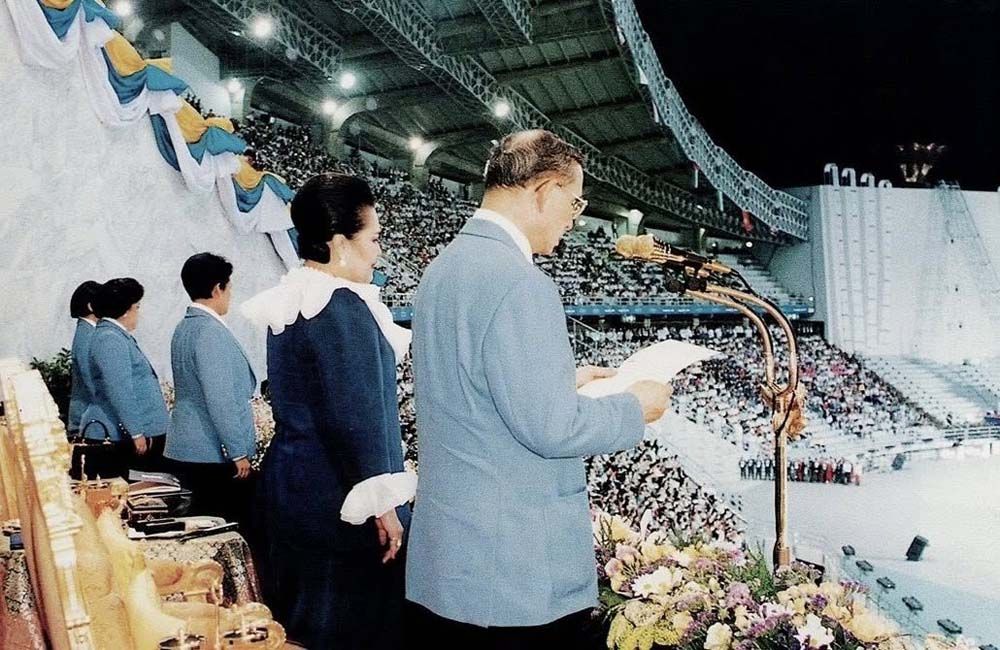 พร้อมข้อความระบุว่า [ ๒๗ ปี ก่อน ในหลวง ร.๙ เสด็จฯ เปิดการแข่งขันกีฬาเอเชียนเกมส์ ครั้งที่ ๑๓ มิตรภาพไร้พรหมแดน ]