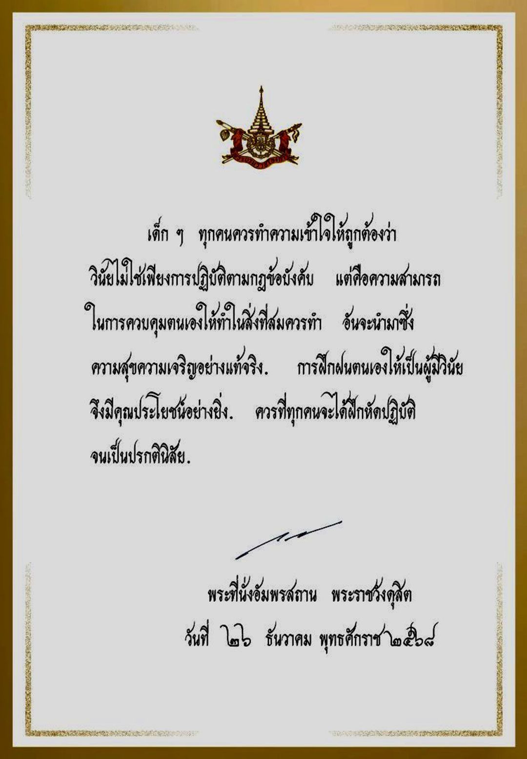 พระบาทสมเด็จพระเจ้าอยู่หัว พระราชทานพระบรมราโชวาท เนื่องในวันเด็กแห่งชาติ ประจำปี 2569 เพื่อเชิญลงพิมพ์ในหนังสือวันเด็กแห่งชาติ พุทธศักราช 2569 ความว่า "เด็กๆ ทุกคนควรทำความเข้าใจให้ถูกต้อง ว่าวินัยไม่ใช่เพียงการ ปฏิบัติตามกฎข้อบังคับ แต่คือความสามารถในการควบคุมตัวเองให้ทำในสิ่งที่สมควรทำ อันจะนำมาซึ่งความสุขความเจริญอย่างแท้จริง การฝึกฝนในตนเองให้เป็นผู้มีวินัย จึงมีคุณประโยชน์อย่างยิ่ง ควรที่ทุกคนจะได้ฝึกหัดปฏิบัติจนเป็นปรกตินิสัย"
