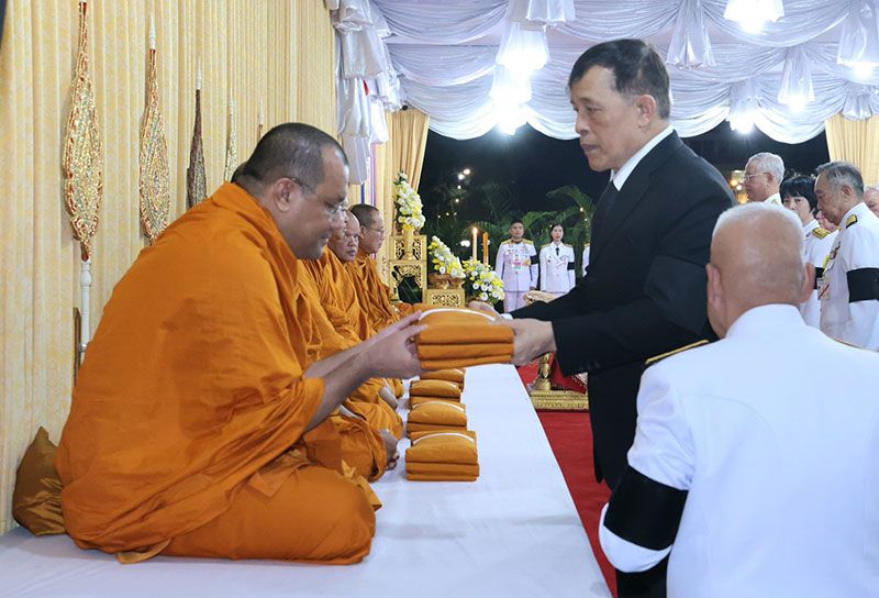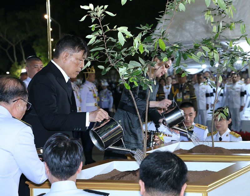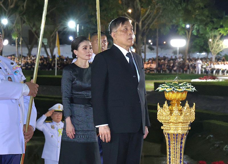 ต่อจากนั้น เสด็จขึ้นลานพระราชานุสาวรีย์ฯ ทรงพระสุหร่าย ทรงเจิมแผ่นคำจารึกที่ฐานพระราชานุสาวรีย์ฯ พระบาทสมเด็จพระเจ้าอยู่หัว และสมเด็จพระนางเจ้าฯ พระบรมราชินี ทรงวางพุ่มดอกไม้ และทรงจุดธูปเทียนเครื่องทองน้อยถวายราชสักการะ ทรงกราบ เสร็จแล้ว เสด็จเข้าพลับพลาพิธี ทรงประเคนจตุปัจจัยไทยธรรมถวายพระสงฆ์ ทรงหลั่งทักษิโณทก พระสงฆ์ถวายอนุโมทนา ถวายอดิเรก ต่อจากนั้น พระราชทานพระบรมราชวโรกาสให้ นายกสภามหาวิทยาลัยแม่ฟ้าหลวง เฝ้าทูลละอองธุลีพระบาท ทูลเกล้าทูลกระหม่อมถวายเงิน โดยเสด็จพระราชกุศลตามพระราชอัธยาศัย อธิการบดีมหาวิทยาลัยแม่ฟ้าหลวง กราบบังคมทูลเบิกผู้มีอุปการคุณ เฝ้าทูลละอองธุลีพระบาท รับพระราชทานของที่ระลึกตามลำดับ เสร็จแล้ว เสด็จพระราชดำเนินไปทรงกราบที่หน้าเครื่องนมัสการ ทรงลาพระสงฆ์ แล้วเสด็จออกจากพลับพลาพิธี ไปทรงปลูกต้นรวงผึ้ง ณ บริเวณด้านหน้าอาคารโรงพยาบาลศูนย์การแพทย์มหาวิทยาลัยแม่ฟ้าหลวง