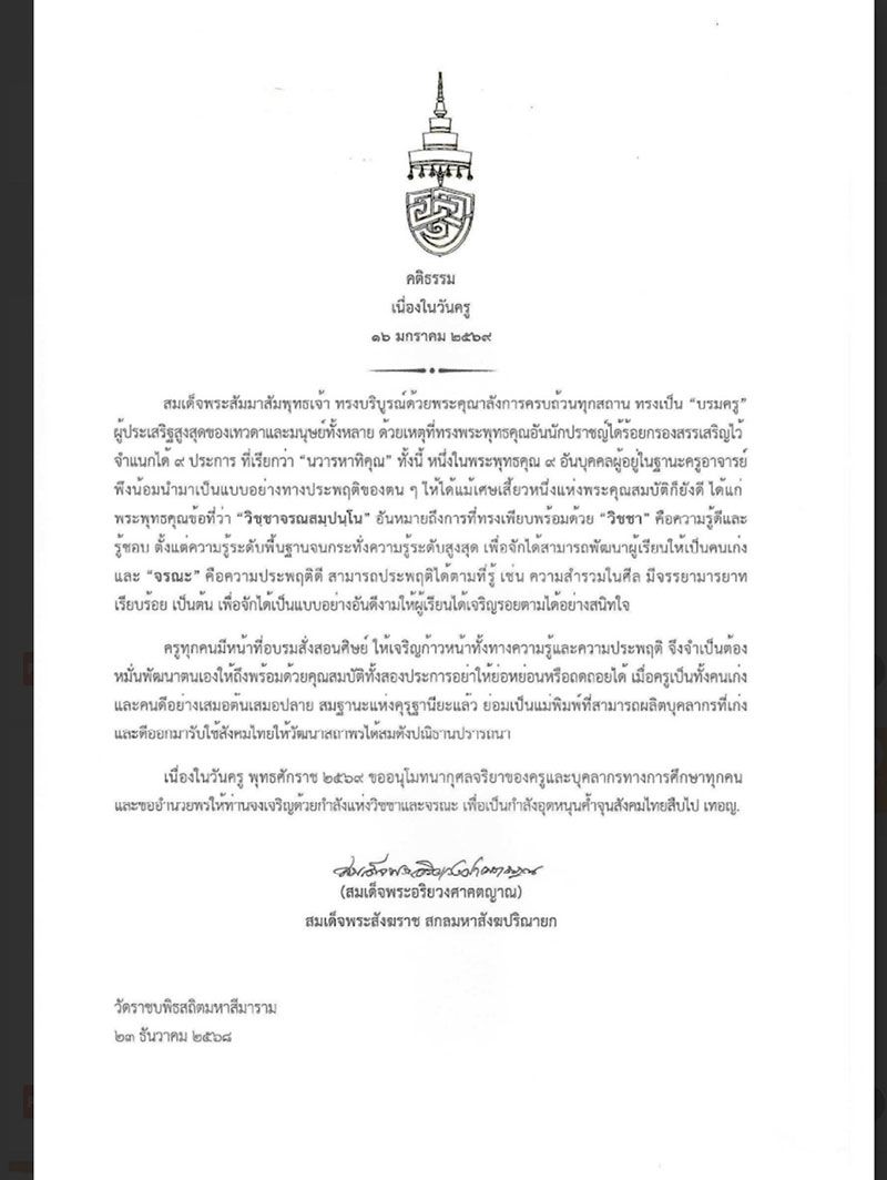 สมเด็จพระสังฆราช สกลมหาสังฆปริณายก ประทานคติธรรม เนื่องในวันครู 16 มกราคม 2569 ความว่า