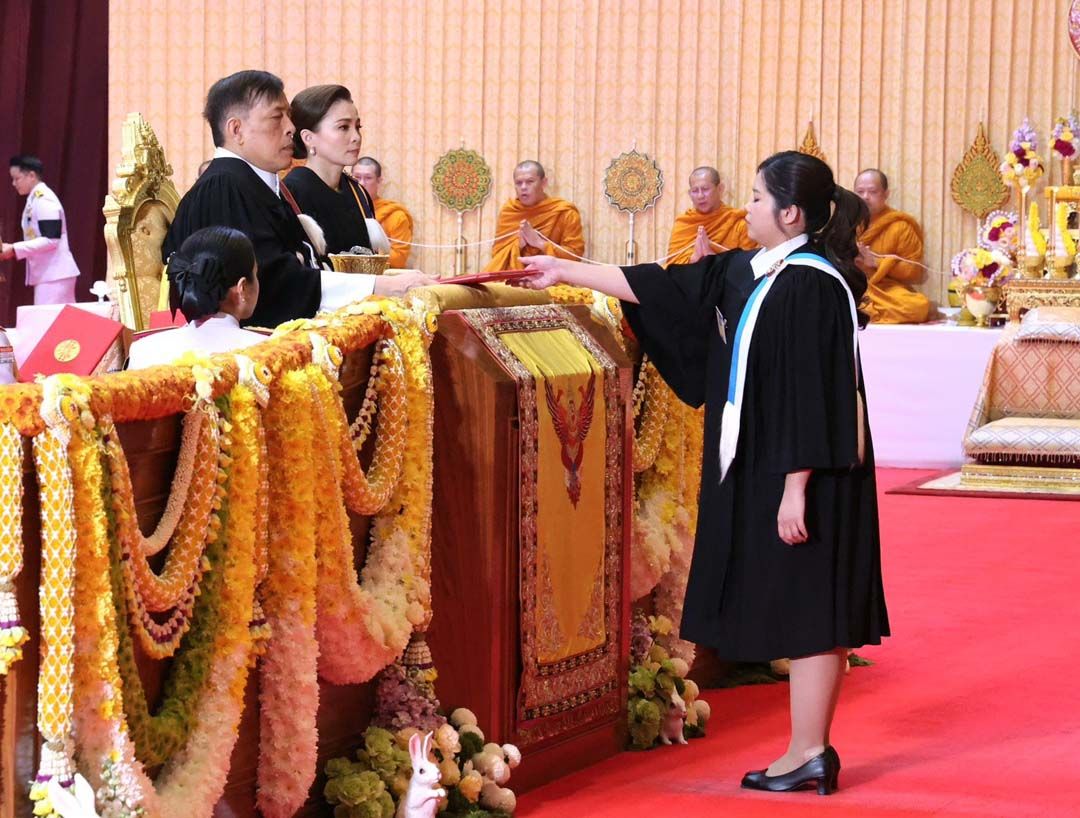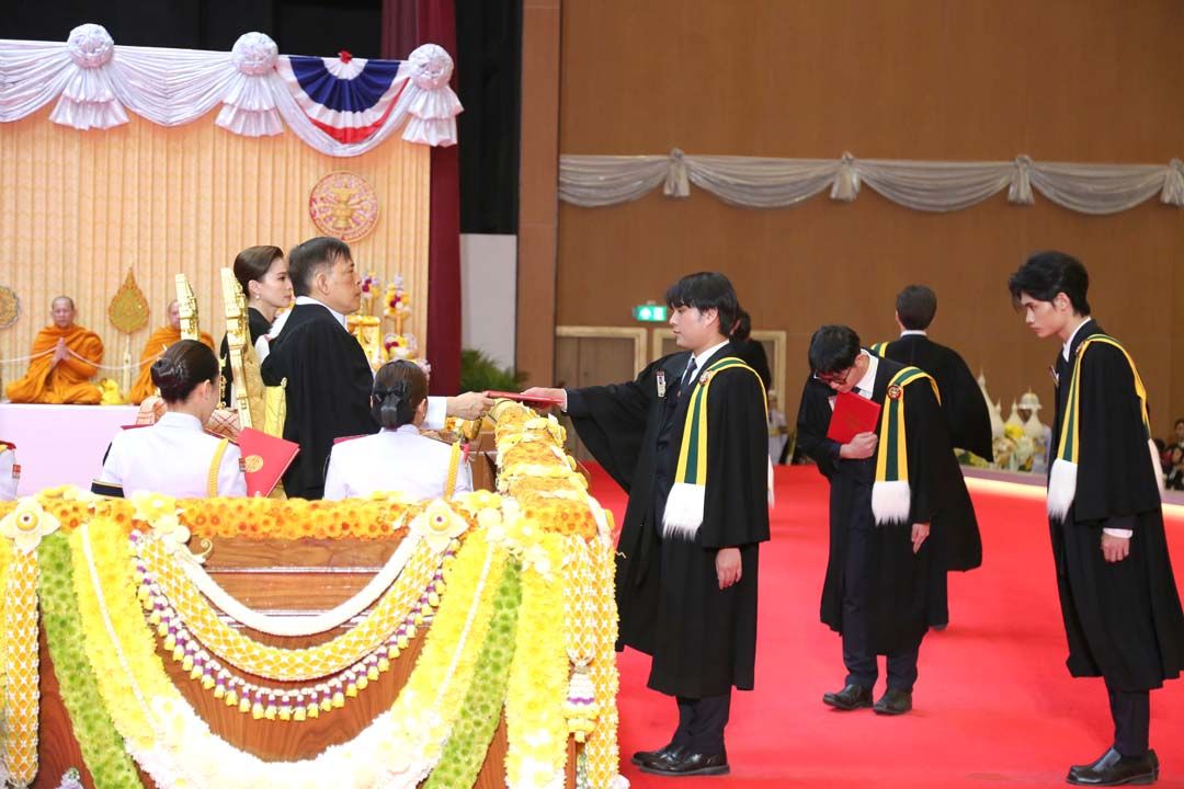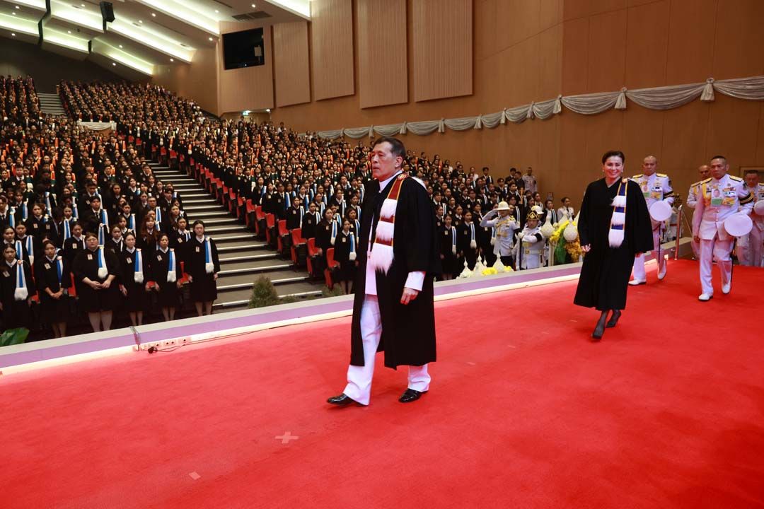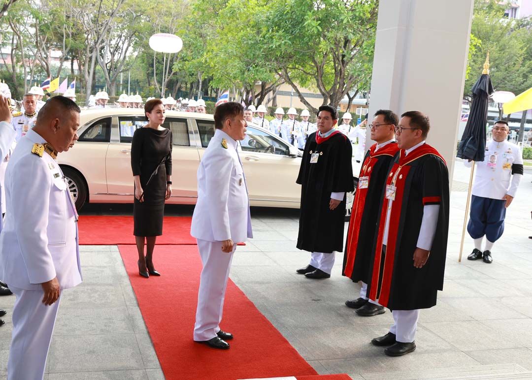 เสด็จฯ ถึงอาคารกิติยาคาร มหาวิทยาลัยธรรมศาสตร์ ศูนย์รังสิต นายเอกวิทย์ มีเพียร ผู้ว่าราชการจังหวัดปทุมธานี, นายชัยพรรษ เสริมสุวรรณ อธิบดีผู้พิพากษาภาค 1, พลโท วรยส เหลืองสุวรรณ แม่ทัพภาคที่ 1, พลตำรวจโท วัฒนา ยี่จีน ผู้บัญชาการตำรวจภูธรภาค 1, นายสุรศักดิ์ พันธ์เจริญวรกุล รัฐมนตรีว่าการกระทรวงการอุดมศึกษา วิทยาศาสตร์วิจัยและนวัตกรรม, ศาสตราจารย์ สุรพล นิติไกรพจน์ นายกสภามหาวิทยาลัยธรรมศาสตร์, ศาสตราจารย์ ศุภสวัสดิ์ ชัชวาลย์ อธิการบดีมหาวิทยาลัยธรรมศาสตร์ พร้อมด้วย ข้าราชการ ผู้บริหาร คณาจารย์ และนักศึกษามหาวิทยาลัยธรรมศาสตร์ เฝ้าฯ รับเสด็จ ผู้แทนคณาจารย์ ผู้แทนบัณฑิต และผู้แทนนักศึกษา ทูลเกล้าฯ ถวายมาลัยข้อพระกร