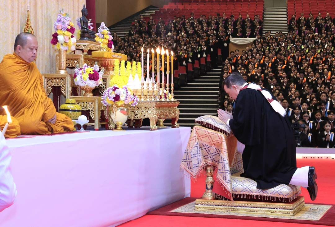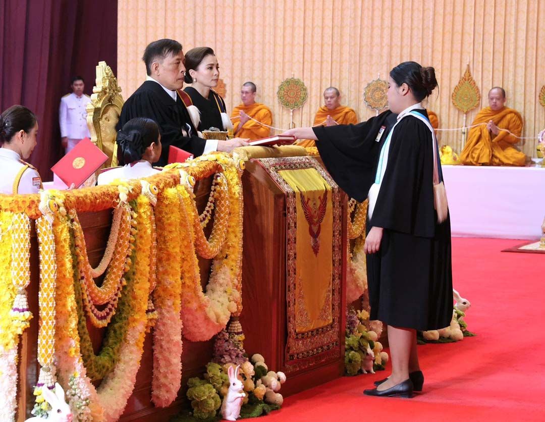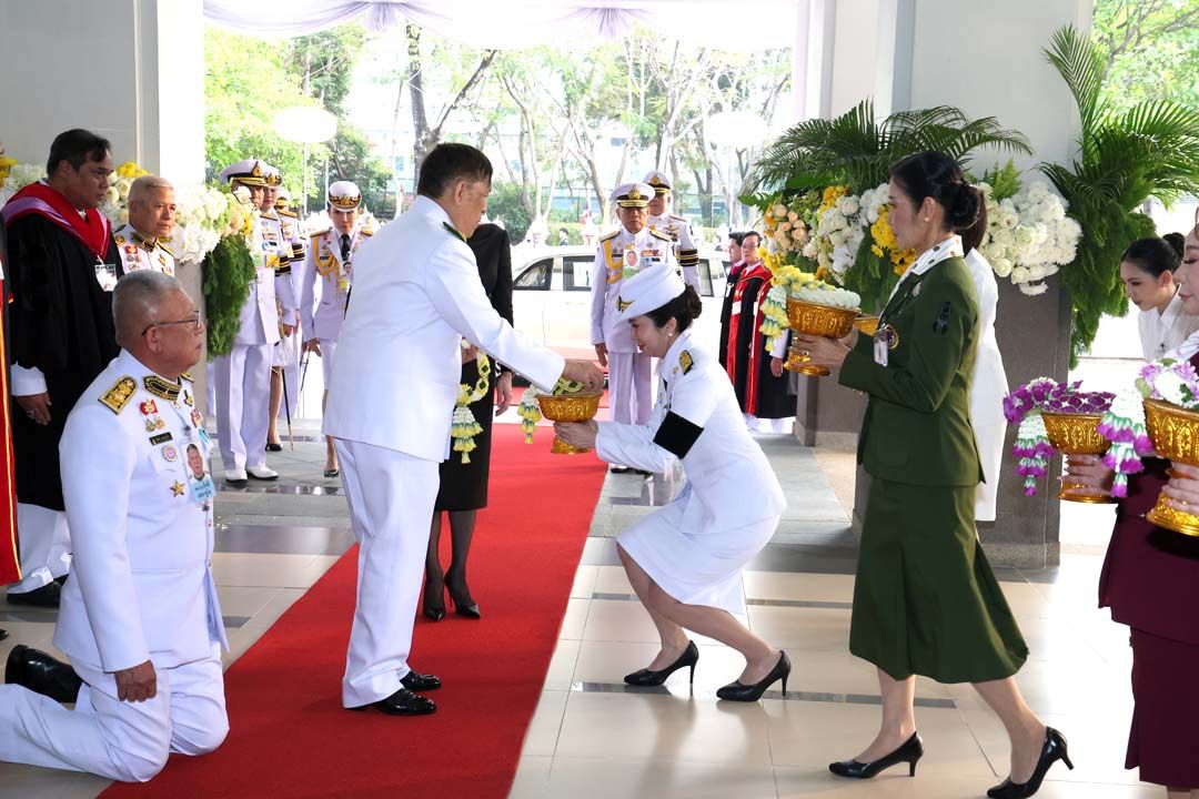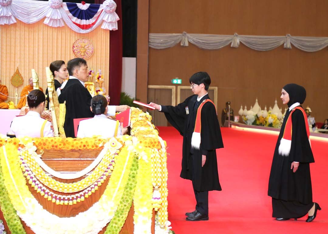 เสด็จฯ ถึงอาคารกิติยาคาร มหาวิทยาลัยธรรมศาสตร์ ศูนย์รังสิต นายเอกวิทย์ มีเพียร ผู้ว่าราชการจังหวัดปทุมธานี, นายชัยพรรษ เสริมสุวรรณ อธิบดีผู้พิพากษาภาค 1, พลโท วรยส เหลืองสุวรรณ แม่ทัพภาคที่ 1, พลตำรวจโท วัฒนา ยี่จีน ผู้บัญชาการตำรวจภูธรภาค 1, นายสุรศักดิ์ พันธ์เจริญวรกุล รัฐมนตรีว่าการกระทรวงการอุดมศึกษา วิทยาศาสตร์วิจัยและนวัตกรรม, ศาสตราจารย์ สุรพล นิติไกรพจน์ นายกสภามหาวิทยาลัยธรรมศาสตร์, ศาสตราจารย์ ศุภสวัสดิ์ ชัชวาลย์ อธิการบดีมหาวิทยาลัยธรรมศาสตร์ พร้อมด้วย ข้าราชการ ผู้บริหาร คณาจารย์ และนักศึกษามหาวิทยาลัยธรรมศาสตร์ เฝ้าฯ รับเสด็จ ผู้แทนคณาจารย์ ผู้แทนบัณฑิต และผู้แทนนักศึกษา ทูลเกล้าฯ ถวายมาลัยข้อพระกร