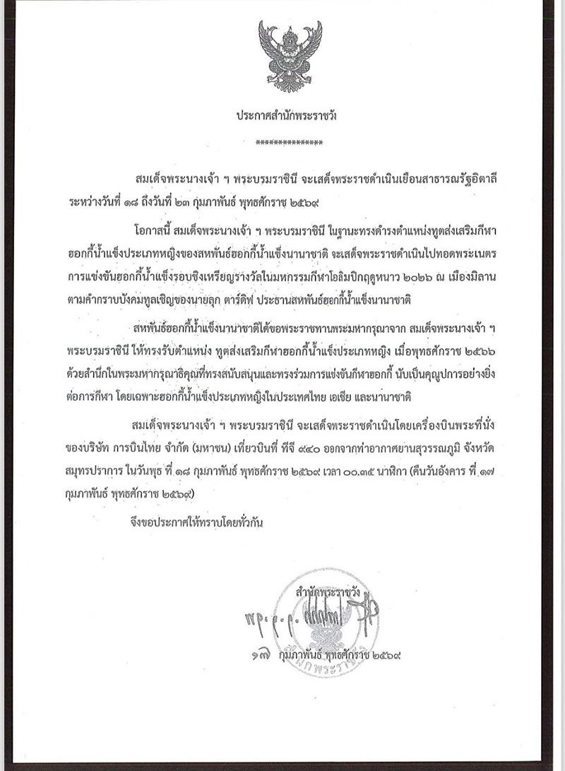 สมเด็จพระนางเจ้า ฯ พระบรมราชินี จะเสด็จพระราชดำเนินโดยเครื่องบินพระที่นั่งของบริษัท การบินไทย จำกัด (มหาชน) เที่ยวบินที่ ทีจี 940 ออกจากท่าอากาศยานสุวรรณภูมิ จังหวัดสมุทรปราการ ในวันพุธ ที่ 18 กุมภาพันธ์ พุทธศักราช 2569 เวลา 00.35 นาฬิกา (คืนวันอังคาร ที่ 17 กุมภาพันธ์ พุทธศักราช 2569) จึงขอประกาศให้ทราบโดยทั่วกัน