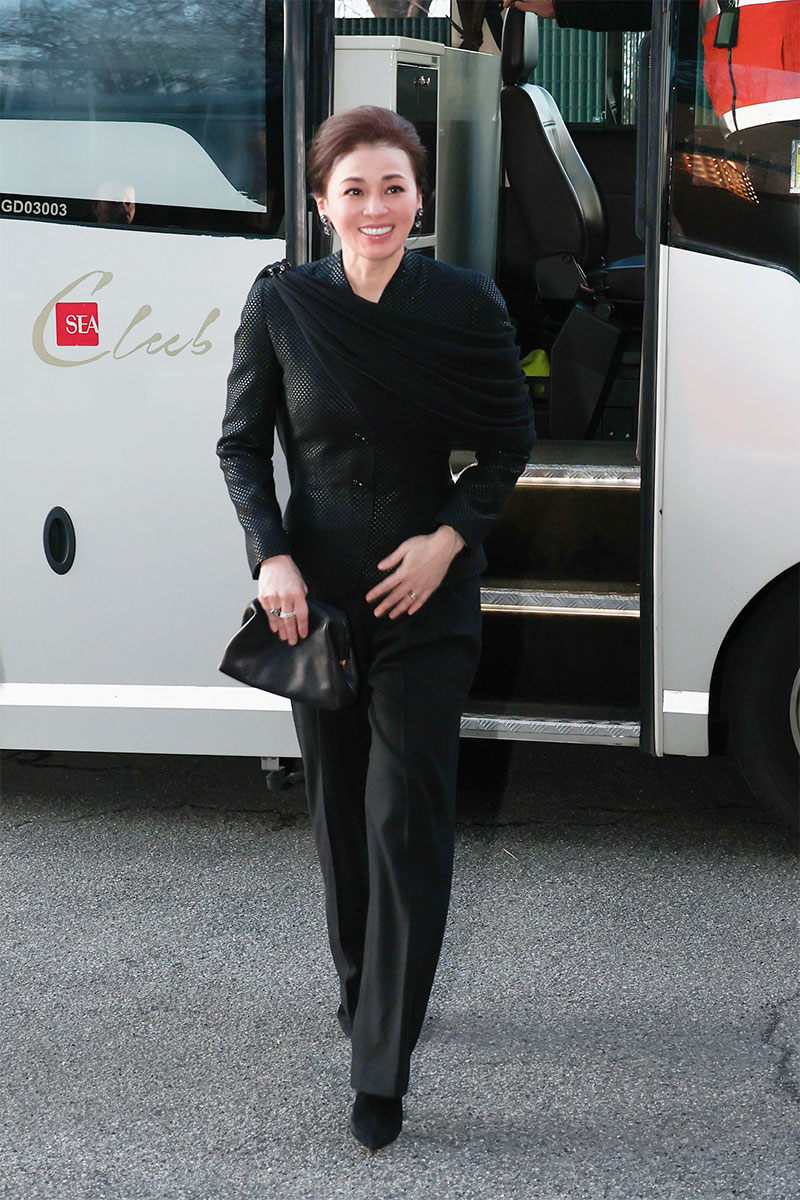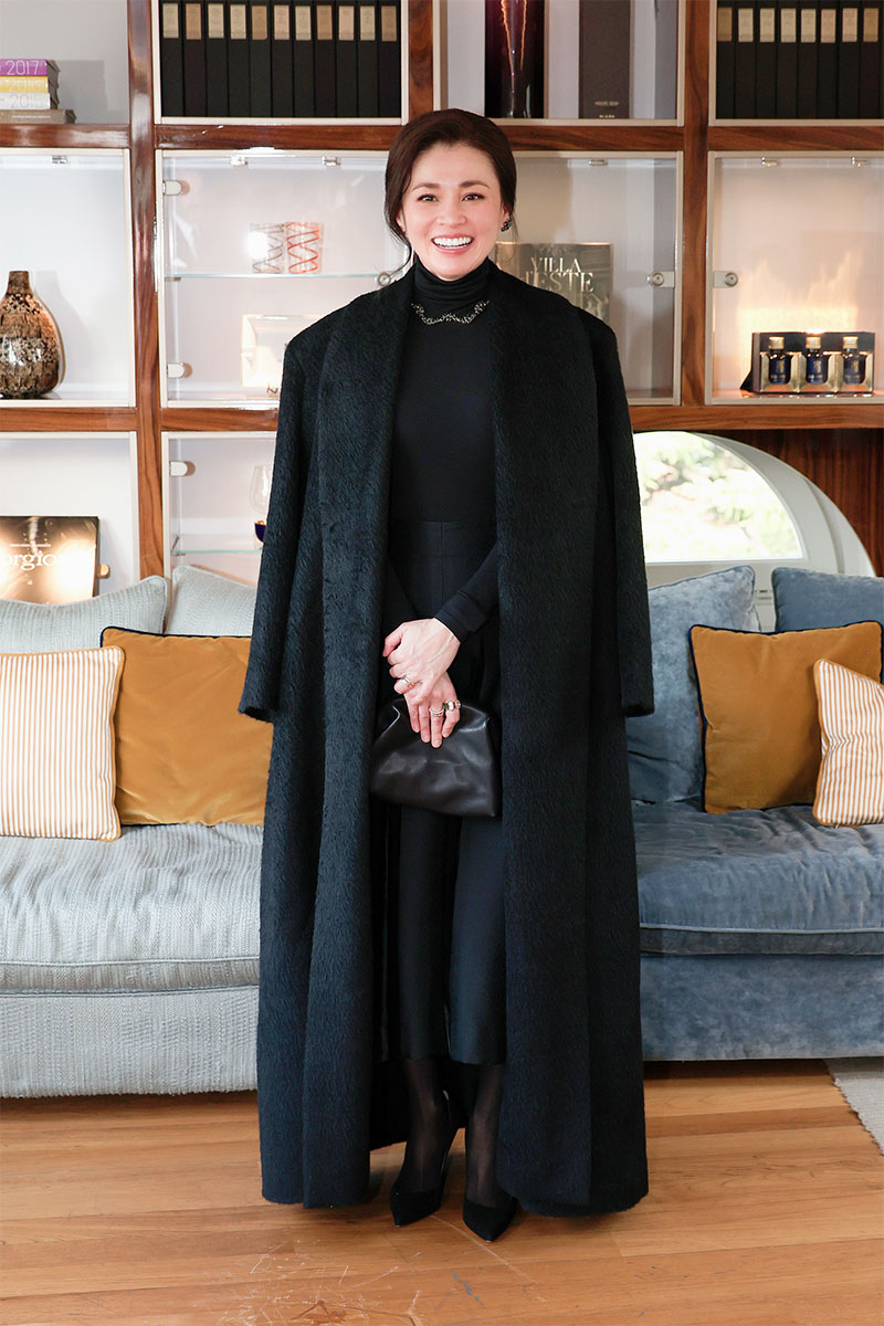 สวมทับด้วยโค้ทยาวผ้าลูกขนสั้นทรงหลวม บุด้านในด้วยผ้าไหมลายเกล็ดเต่า เพิ่มมิติความหรูหรา ชุดเครื่องประดับเป็นเซตอควาแมรีนหลังเบี้ย (Cabochon) ตัวเรือนเงินรมดำ ประกอบด้วยสร้อยคอแบบริเวียร์ (Rivière) พร้อมต่างหูเข้าชุด โทนสีเขียวของอัญมณีตัดกับสีดำอย่างสง่างาม