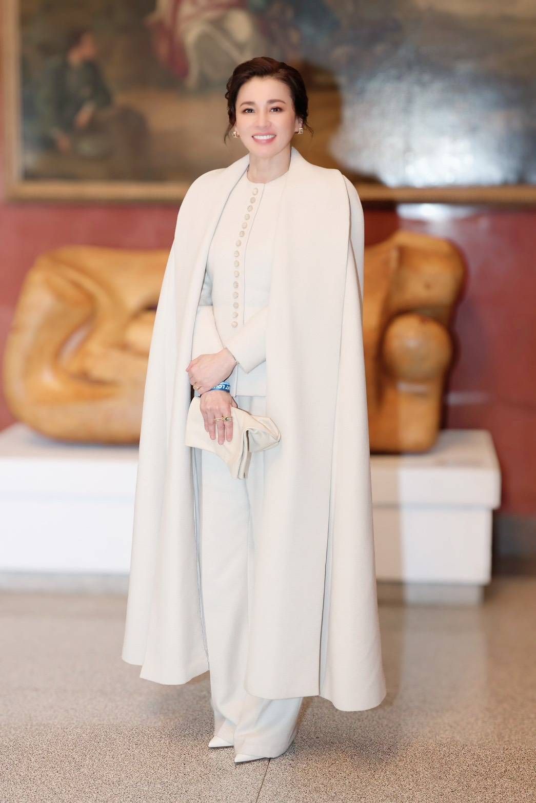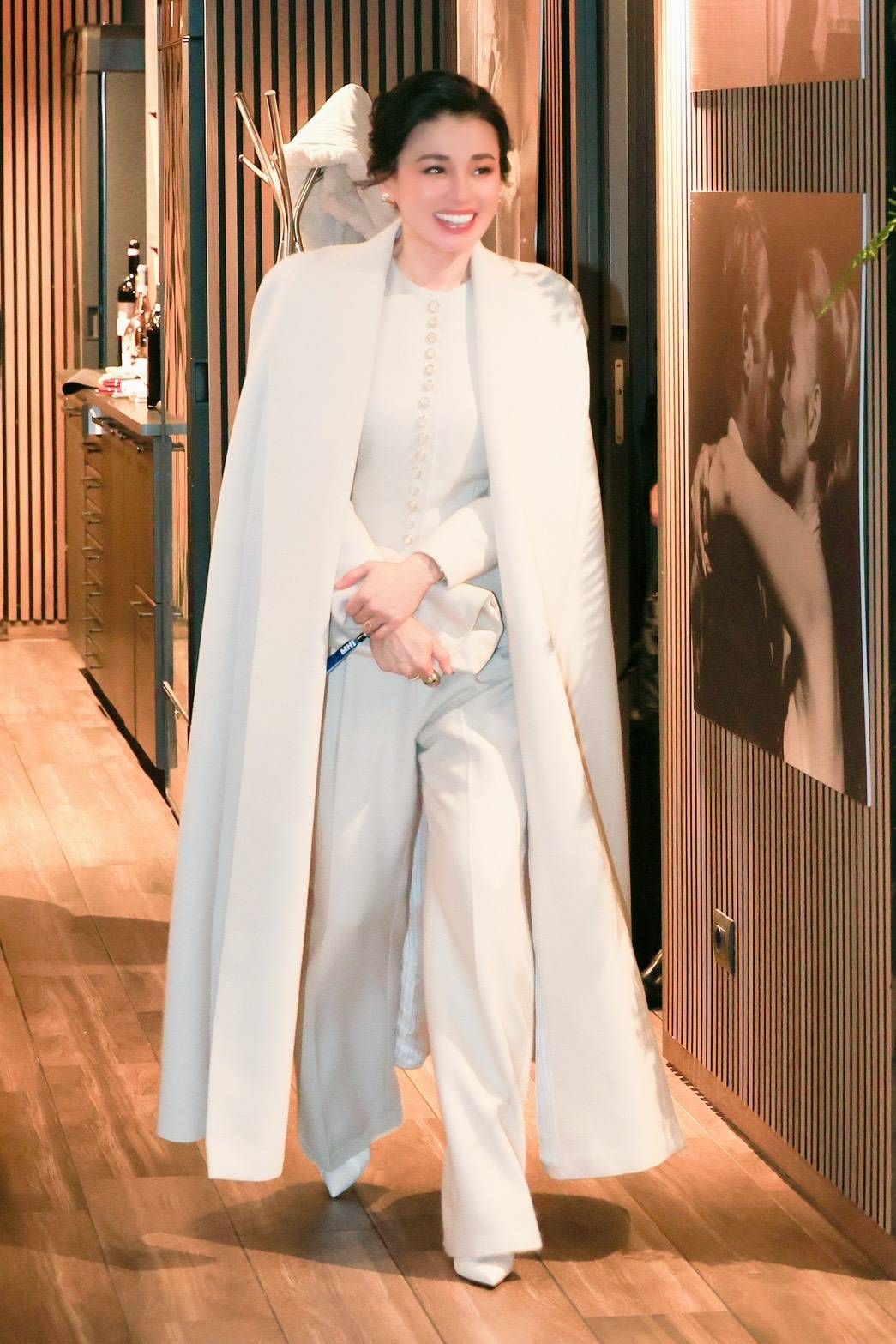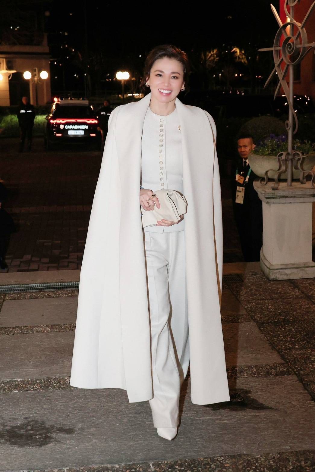 ขณะที่ฉลองพระองค์ชุดที่ 4 ทรงเปลี่ยนลุคเป็นโทนสีขาวนวล (Cloud Dancer) คอกลม ผ้าวูล กระดุมหินควอตซ์ (Quartz) ฐานเงิน ใส่คู่กับกางเกงทรงตรง (Cigarette) สีเดียวกัน สวมคลุมด้วยเคปยาว ตัดเย็บด้วยผ้าวูลเนื้อเดียวกัน โครงทรงตรงปกในตัว กระเป๋าหนังสีครีมประดับเงิน และรองเท้าบูทเรียบสีครีม เครื่องประดับเป็นเข็มกลัดไข่มุกคู่ (Lodolite Quartz) ตัวเรือนทอง ติดบริเวณอกด้านซ้าย โทนสีครีมตัดกับสีขาวนวล โดยฉลองพระองค์นั้นรังสรรค์จากห้องเสื้อ MESHMUSEUM
