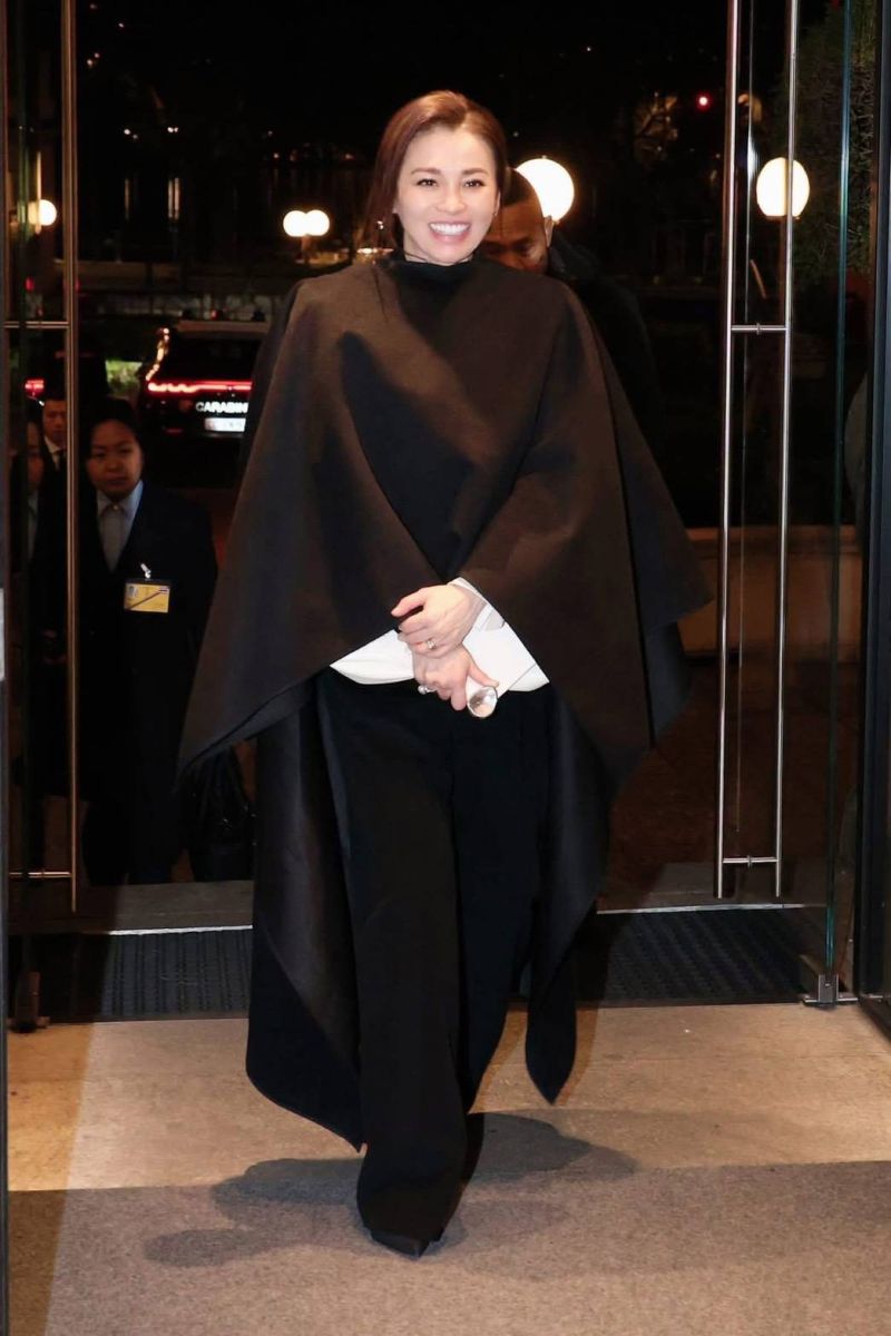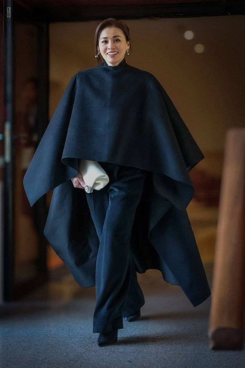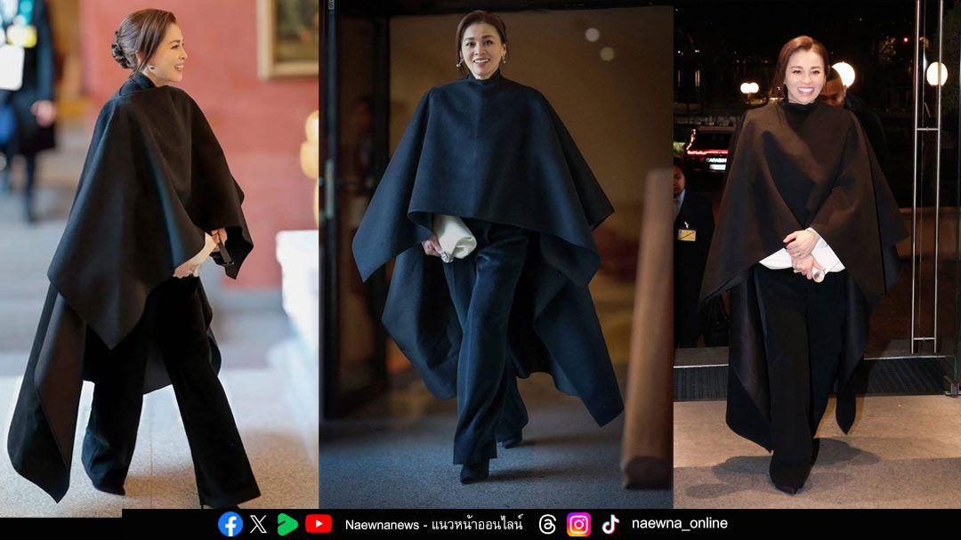 ชุดเสื้อแจ็กเก็ตตัวครอปแขนยาวสีดำ คอกลม ผ้าวูล กระดุมนิลทรงโค้งฐานเงินรมดำเรียงด้านหน้า ปลายแขนตกแต่งด้วยผ้าไหมสีขาว ใส่คู่กับกางเกงทรงตรงเอวสูงสีดำ สวมคลุมด้วยผ้าคลุมไหล่ยาว สีดำ ผ้าวูลผสมผ้าไหมทอยกลาย ทรงปล่อยชายแบบอสมมาตร กระเป้าหนังสีดำ รองเท้าเรียบสีดำ เครื่องประดับเป็นต่างหูไข่มุกตาฮิติสีเทา (Tahitian Pearls) ตัวเรือนเงินฝังเพชร และแหวนไข่มุก เซาท์ซีล้อมเพชร ตัวเรือนทองคำขาว โทนเทาตัดกับสีดำ ขอบคุณ : ห้องเสื้อ MESHMUSEUM