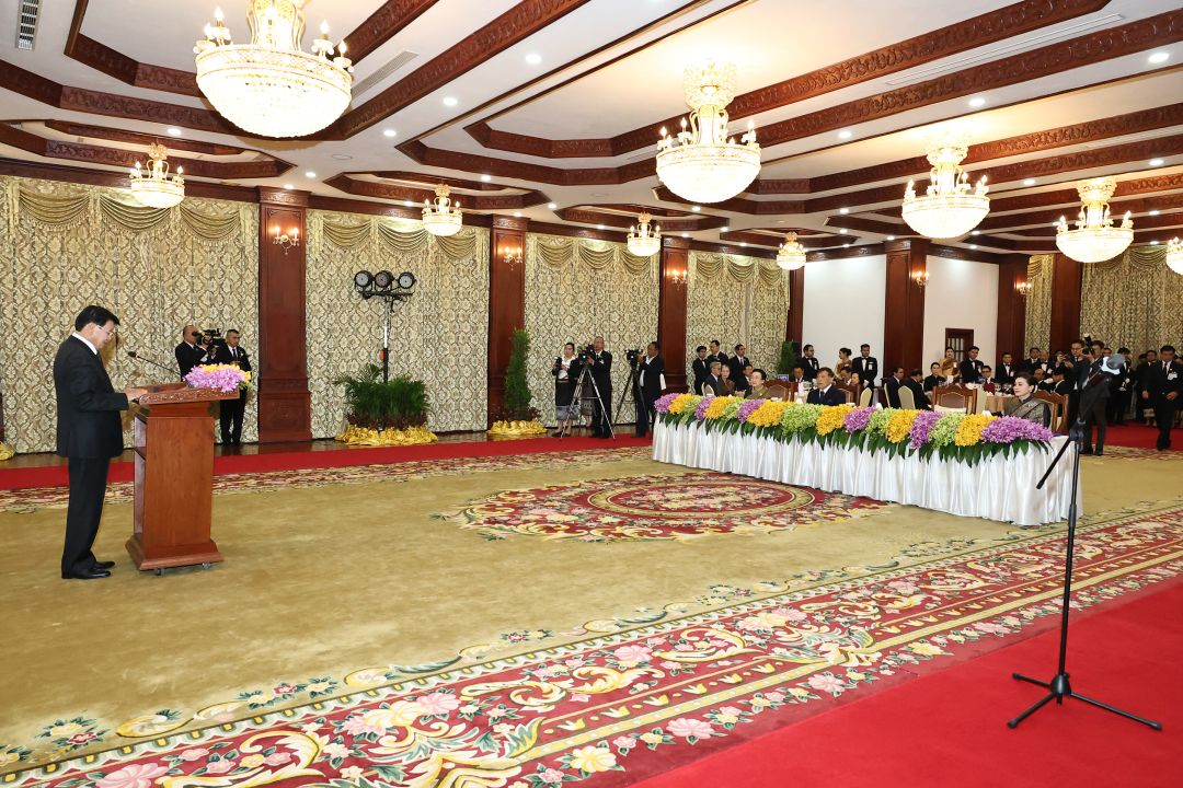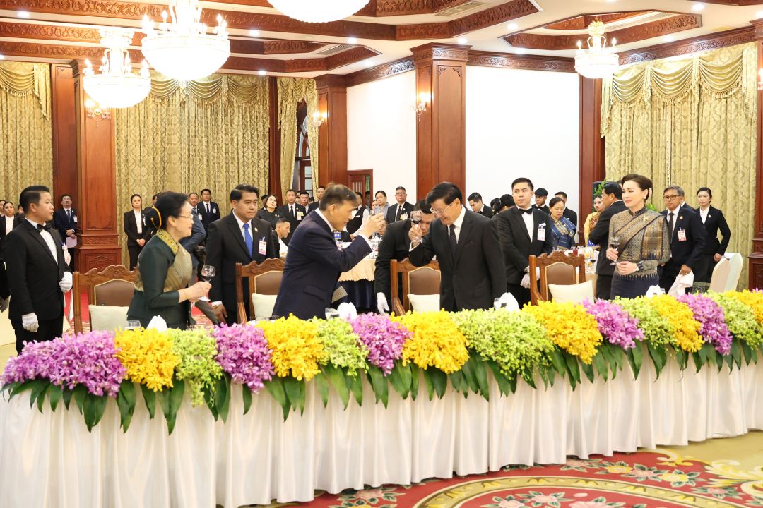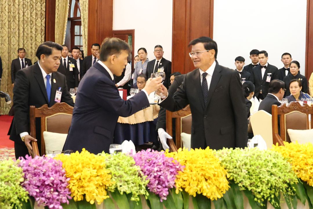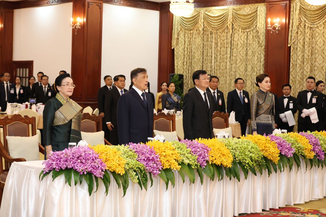 ในโอกาสนี้ ประธานประเทศ กล่าวสุนทรพจน์ และเชิญชวนแขกผู้มีเกียรติดื่มถวายพระพรชัยมงคลแด่พระบาทสมเด็จพระเจ้าอยู่หัว และสมเด็จพระนางเจ้า ฯ พระบรมราชินี จากนั้น พระบาทสมเด็จพระเจ้าอยู่หัว พระราชทานพระราชดำรัส และเชิญชวนแขกผู้มีเกียรติดื่มอวยพรแก่ประธานประเทศ และภริยา ในการนี้ ทอดพระเนตรการแสดงทางวัฒนธรรมที่ฝ่ายลาวจัดถวาย เมื่อจบการแสดง พระราชทานกระเช้าดอกไม้แก่
