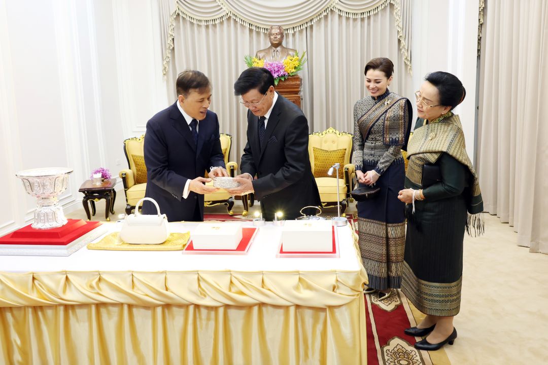 จากนั้น พระราชทานพระบรมราชานุญาตให้ ประธานประเทศผูกสายสิญจน์ที่ข้อพระหัตถ์ซ้ายพระบาทสมเด็จพระเจ้าอยู่หัว และภริยาประธานประเทศ ขอพระราชทานพระบรมราชานุญาตผูกสายสิญจน์ที่ข้อพระหัตถ์ซ้ายสมเด็จพระนางเจ้า ฯ พระบรมราชินี เสร็จแล้ว เสด็จพระราชดำเนินไปยังห้องเฝ้า พระราชทานพระบรมราชวโรกาสให้ ประธานประเทศ และภริยา เฝ้า ถวายของขวัญ เป็นพานเงิน กระเป๋าและชุดผ้าไหมลาว ในโอกาสนี้ พระบาทสมเด็จพระเจ้าอยู่หัว และสมเด็จพระนางเจ้า ฯ พระบรมราชินี พระราชทานของขวัญ เป็นกล่องเงิน และกระเป๋าย่านลิเภา แด่ประธานประเทศ และภริยา