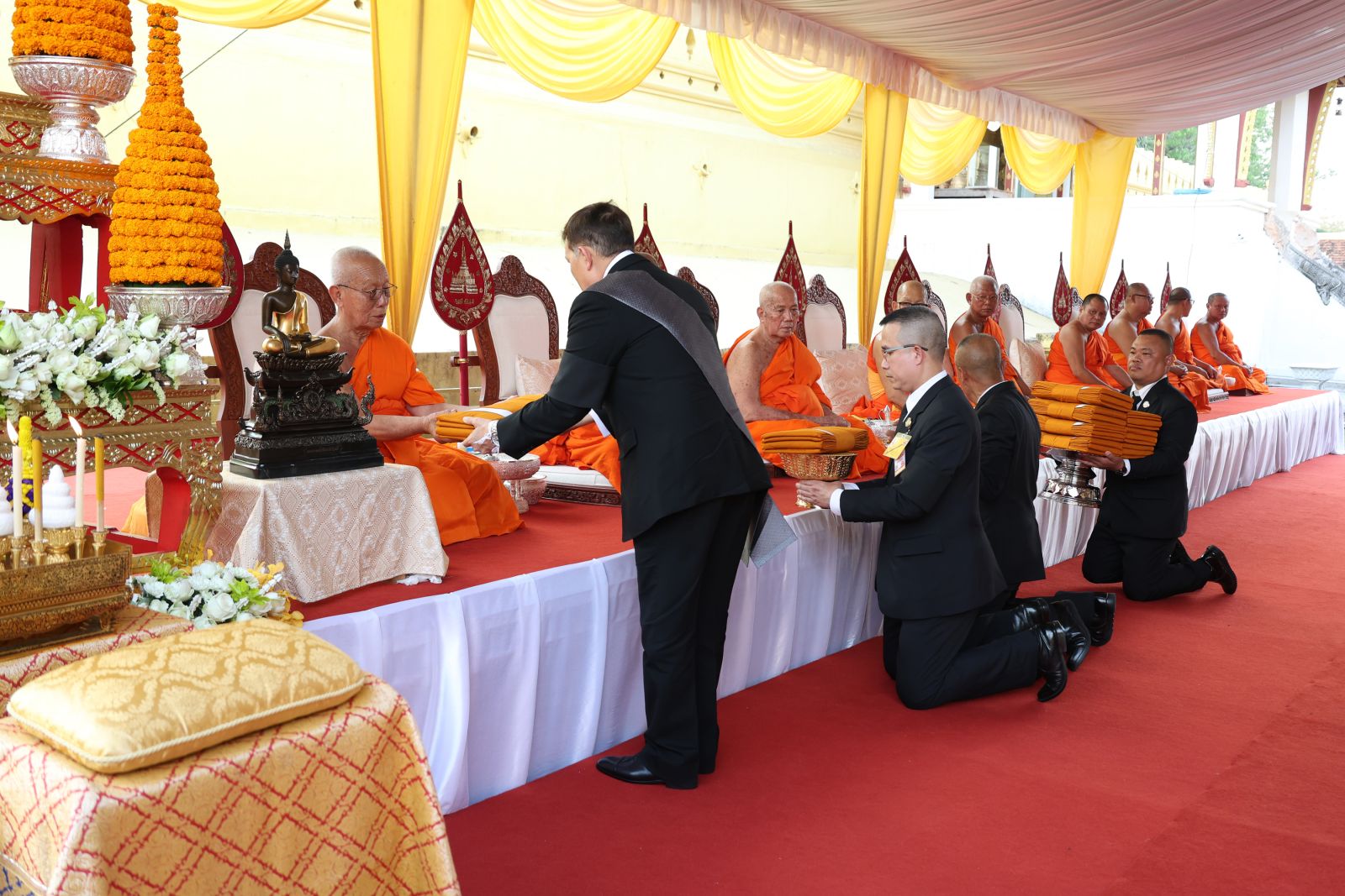 เสร็จแล้ว ทรงประเคนจตุปัจจัยไทยธรรม แด่พระมหาเถระลาว ทรงหลั่งทักษิโณทก ทรงลาพระมหาเถระลาว แล้วทรงกราบที่หน้าเครื่องนมัสการ ในการนี้ พระอาจารย์ใหญ่มะหาเหวด มะเสไน ถวายพระพุทธรูปองค์ตื้อ จำนวน 1 องค์ แด่พระบาทสมเด็จพระเจ้าอยู่หัว จากนั้น ทรงลงพระปรมาภิไธย และพระนามาภิไธย ไว้เป็นที่ระลึก สมควรแก่เวลาจึงเสด็จพระราชดำเนินออกจากพลับพลาที่ประทับ ไปประทับรถยนต์พระที่นั่ง เสด็จพระราชดำเนินไปยังท่าอากาศยานนานาชาติวัดไต นครหลวงเวียงจันทน์ ณ ที่นั้น นายสะเหลิมไซ กมมะลิด รองนายกรัฐมนตรี นางอาลุนี กมมะลิด ภริยารองนายกรัฐมนตรี สาธารณรัฐประชาธิปไตยประชาชนลาว นางครองขนิษฐ รักษ์เจริญ เอกอัครราชทูต ณ เวียงจันทน์ ผู้ช่วยทูตฝ่ายทหารบกและภริยา ผู้ช่วยทูตฝ่ายทหารอากาศและภริยา รวมทั้งข้าราชการฝ่ายลาว และฝ่ายไทย เฝ้าทูลละอองธุลีพระบาทส่งเสด็จ