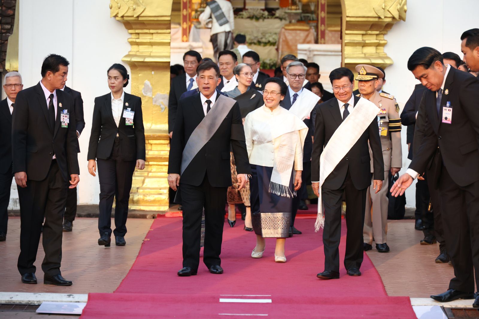 เมื่อเสด็จฯ ถึง ประธานประเทศ และภริยา พร้อมด้วยรัฐมนตรีว่าการกระทรวงวัฒนธรรมและการท่องเที่ยว เจ้าครองนครหลวงเวียงจันทน์ และคณะกรรมการปกครองเมืองไซเสดถา และประชาชนชาวลาว เฝ้าทูลละอองธุลีพระบาทรับเสด็จ จากนั้น พระบาทสมเด็จพระเจ้าอยู่หัว และสมเด็จพระนางเจ้า ฯ พระบรมราชินี เสด็จพระราชดำเนินขึ้นหอไหว้ด้านทิศตะวันตก พร้อมด้วยประธานประเทศและภริยา ทรงจุดธูปเทียนเครื่องสักการะแบบลาว ทรงสักการะพระธาตุหลวง และพระพุทธรูปสำคัญประจำพระธาตุหลวง ตามธรรมเนียมฝ่ายลาว เสร็จแล้ว เสด็จพระราชดำเนินไปยังพลับพลาพิธีสงฆ์ ทรงจุดธูปเทียนบูชาพระรัตนตรัย พระมหาเถระลาว 9 รูป เจริญพระพุทธมนต์ โดยมีพระอาจารย์ใหญ่มะหาเหวด มะเสไน ประธานศูนย์กลางองค์การพุทธศาสนาสัมพันธ์แห่งสาธารณรัฐประชาธิปไตยประชาชนลาว เป็นประธาน