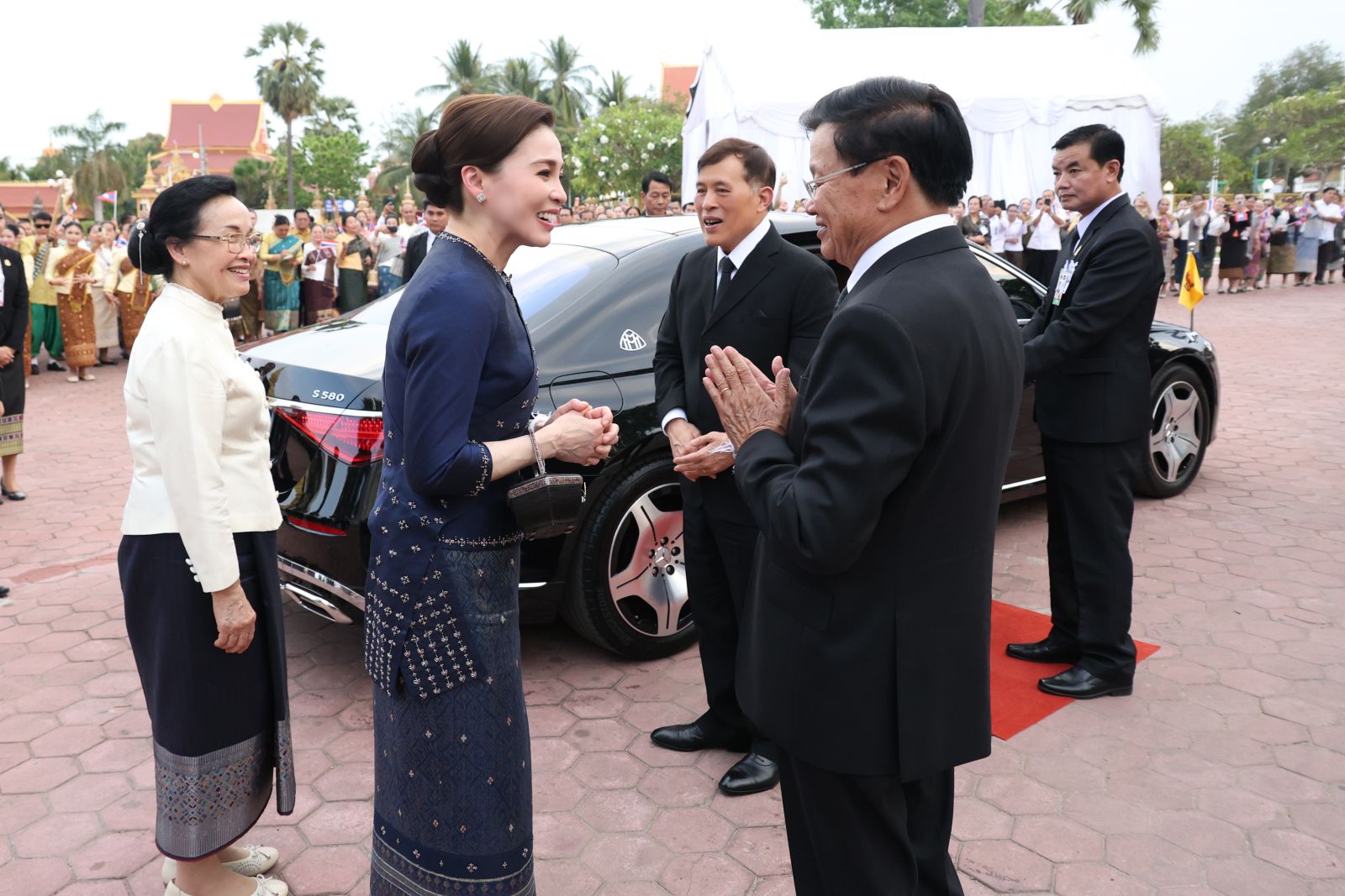 ต่อมาเวลา 16.50 น. (เวลาท้องถิ่น) พระบาทสมเด็จพระเจ้าอยู่หัว และสมเด็จพระนางเจ้า ฯ พระบรมราชินี เสด็จพระราชดำเนินโดยรถยนต์พระที่นั่ง จากโรงแรมคราวน์พลาซ่า เวียงจันทน์ ซึ่งเป็นเป็นโรงแรม