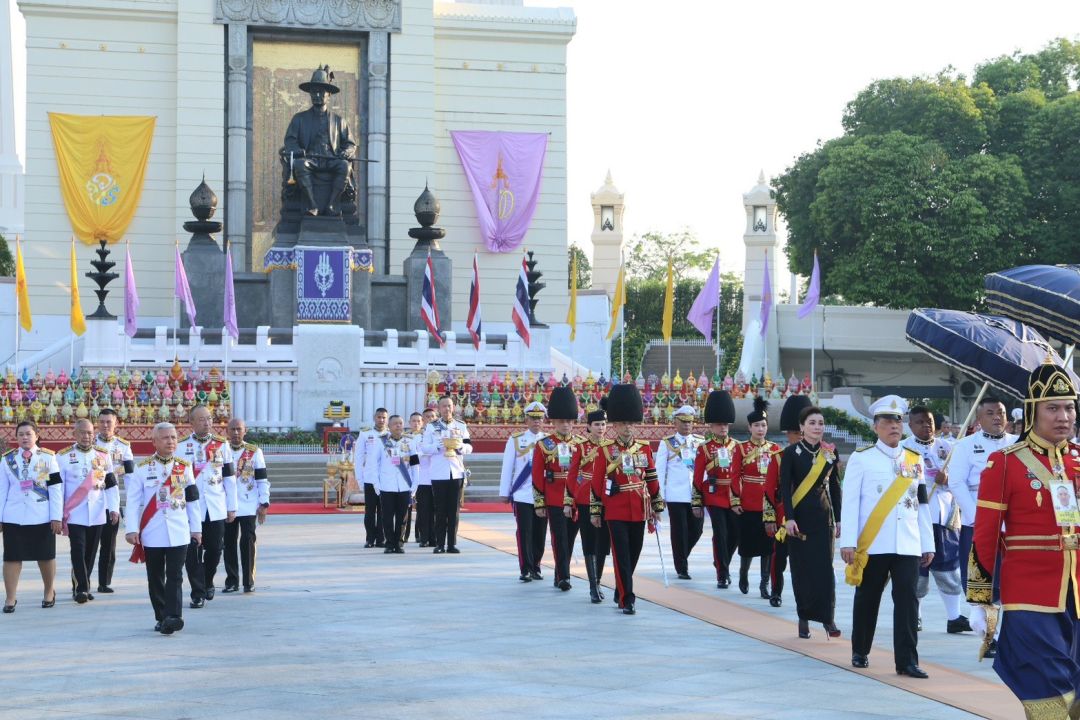 เมื่อเสด็จพระราชดำเนินถึงปฐมบรมราชานุสรณ์ พระบาทสมเด็จพระเจ้าอยู่หัว ทรงวางพุ่มดอกไม้ส่วนพระองค์ สมเด็จพระนางเจ้าฯ พระบรมราชินี ทรงวางพุ่มดอกไม้ส่วนพระองค์ เสร็จแล้ว พระบาทสมเด็จพระเจ้าอยู่หัว และสมเด็จพระนางเจ้าฯ พระบรมราชินี ทรงจุดธูปเทียนเครื่องนมัสการทองทิศ และทรงจุดธูปเทียนเครื่องทองน้อยถวายราชสักการะ ทรงกราบ จากนั้น ประทับรถยนต์พระที่นั่ง เสด็จพระราชดำเนินไปยังวัดพระศรีรัตนศาสดาราม และปราสาทพระเทพบิดร พระบรมมหาราชวัง