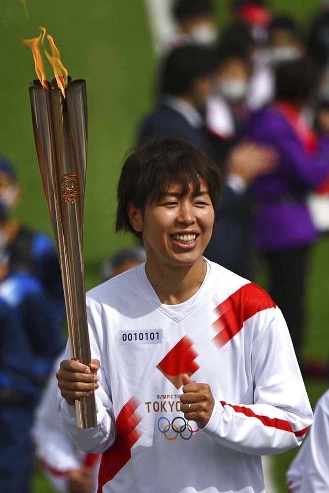 ผู้ถือคบเพลิงวิ่งเป็นคนแรก คือ อาซูสะ อิวาชิมิซึ ปราการหลังทีมชาติญี่ปุ่น ชุดแชมป์ประวัติศาสตร์ฟุตบอลโลกหญิง ปี 2011 และเหรียญเงินโอลิมปิกเกมส์ 2012 ซึ่งติดทีมชาติไปทั้งสิ้น 122 นัด ทำได้ 11 ประตู