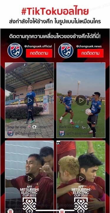 TikTok จับมือ ทัพช้างศึก และ AFF Mitsubishi Electric Cup 2022 (เอเอฟเอฟ มิตซูบิชิ อิเล็คทริค คัพ 2022) สร้างคอนเทนต์ปลุกกระแสเชียร์บอลไทย ชวนคนไทย ร่วมส่งแรงเชียร์ ทีมฟุตบอลทีมชาติไทย ในการแข่งขันฟุตบอลชิงแชมป์อาเซียน 2022 ที่กำลังฟาดแข้งกันในตอนนี้
