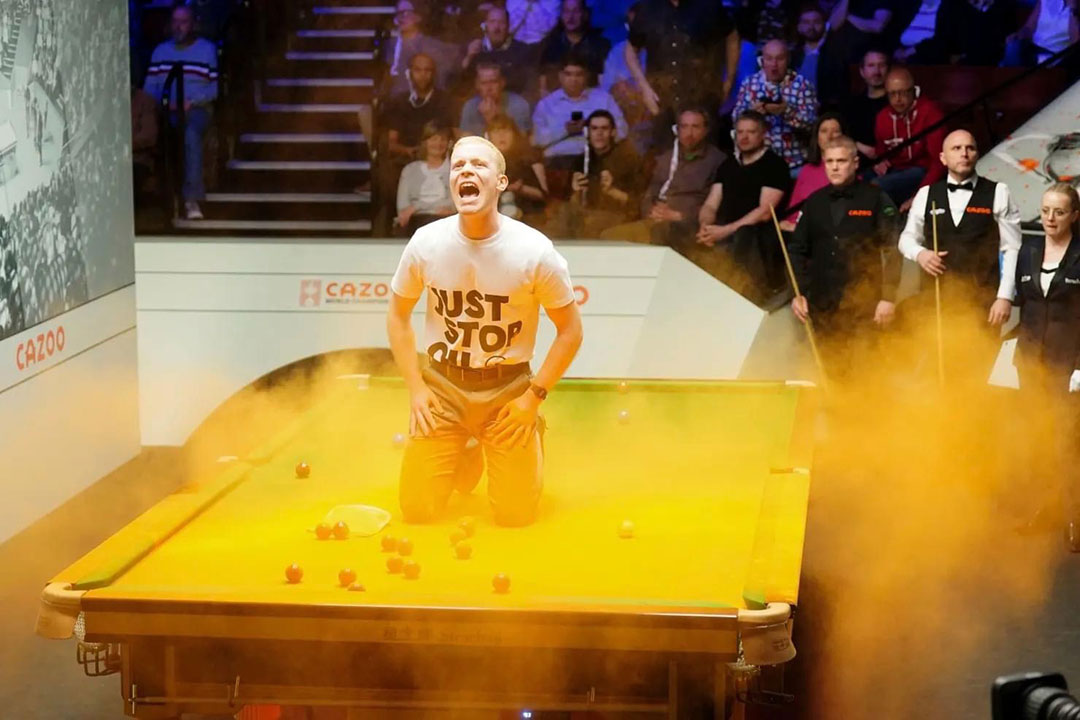 กลุ่มนักเคลื่อนไหวด้านสิ่งแวดล้อม "Just Stop Oil" สร้างความปั่นป่วนให้กับวงการกีฬาอีกครั้ง หลังจากพวกเขาลงมาประท้วงที่ครูซิเบิ้ล เธียเตอร์ และปีนขึ้นบนโต๊ะสนุ้กเกอร์อย่างน่าเกลียดที่สุด