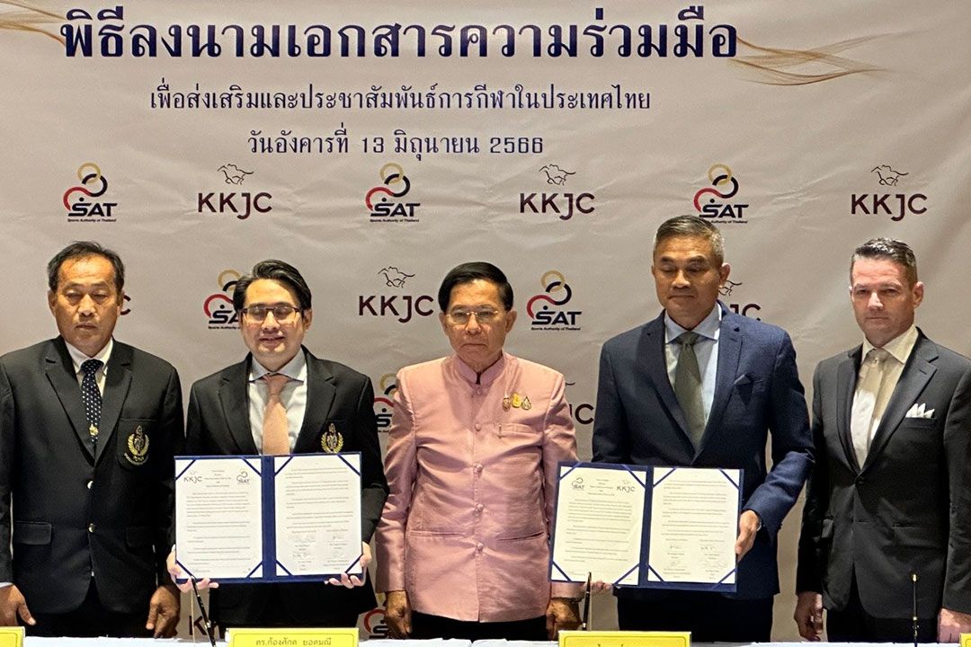 ทั้งนี้ ดร.ก้องศักด ยอดมณี ผู้ว่าการการกีฬาแห่งประเทศไทย นายไวพจน์ เพชรพูล ประธานกรรมการ KKJC ผู้แทนจาก KKJC, Peter O’Neill (CEO) และกกท.ลงนามความร่วมมือครั้งนี้ ที่มุ่งสร้างประโยชน์ร่วมกันทั้งสองฝ่าย โดยมีนายประสาน หวังรัตนปราณี ผู้ช่วยรัฐมนตรีประจำสำนักนายกรัฐมนตรี เป็นสักขีพยาน