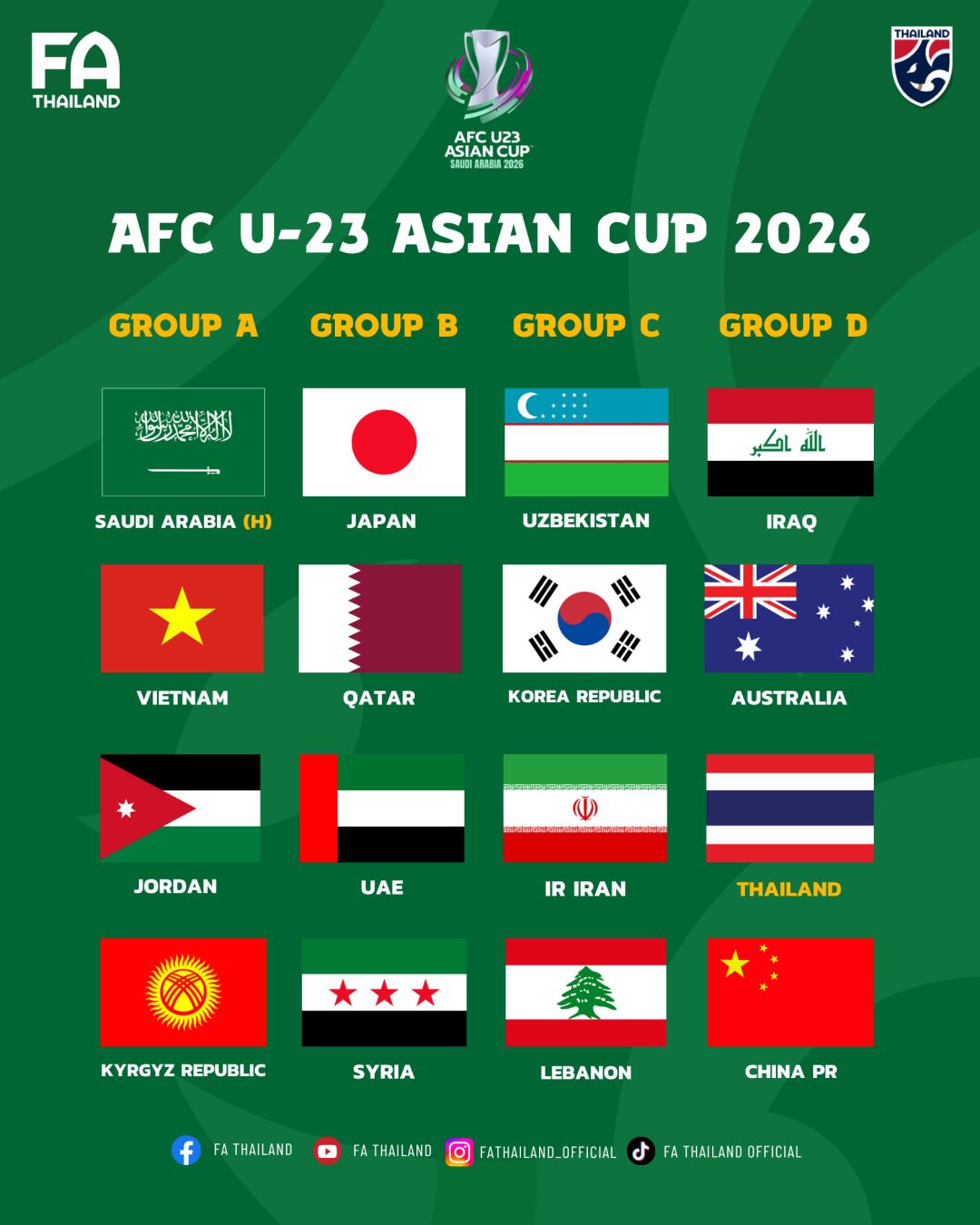 โดยการแข่งขันฟุตบอลรายการดังกล่าว จะจัดขึ้นที่ ซาอุดีอาระเบีย ระหว่างวันที่ 7-25 มกราคม 2569 ซึ่งมี 16 ชาติที่ผ่านเข้ารอบสุดท้าย ผลปรากฏว่าทัพ "ช้างศึก" ทีมชาติไทย จะอยู่ในสาย D ร่วมสายกับ อิรัก,ออสเตรเลีย และ จีน