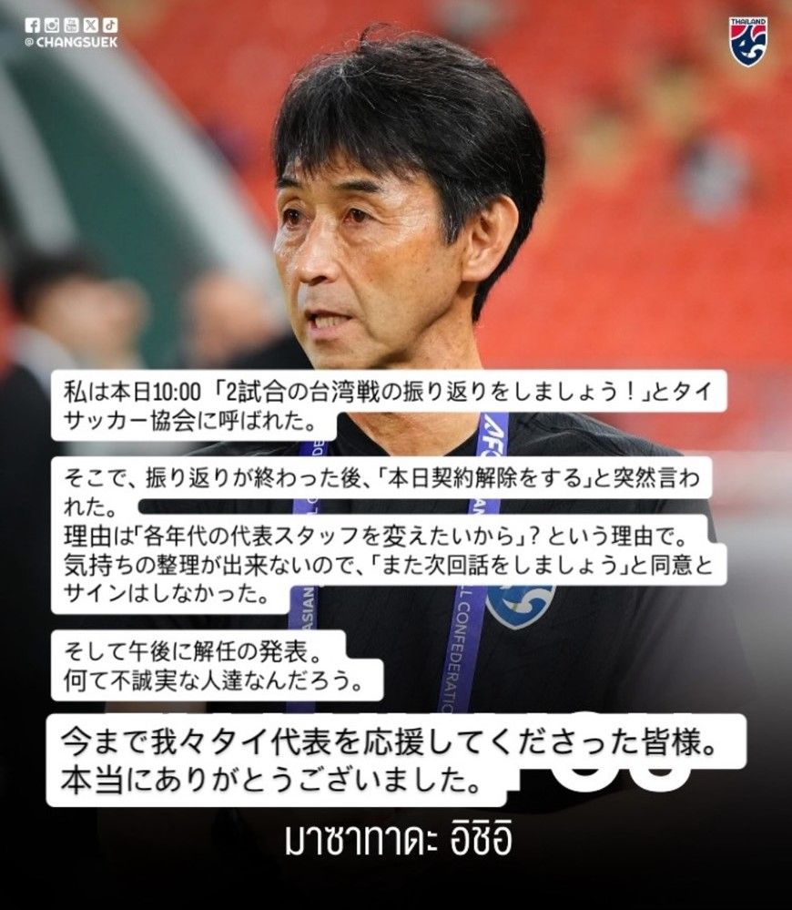 ความคืบหน้าหลังจากที่ มาซาทาดะ อิชิอิ ที่เพิ่งกลายเป็นกุนซือทีมชาติไทย หลังโดนคณะบริหารด้านฝ่ายเทคนิคของ สมาคมกีฬาฟุตบอลฯ นำโดย "โค้ชหรั่ง" ดร.ชาญวิทย์ ผลชีวิน อุปนายกสมาคมฯ และ "เดอะตุ๊ก" ปิยะพงษ์ ผิวอ่อน สภากรรมการ ทำการประเดิมผลงานในการทำหน้าที่คุมทัพ "ช้างศึก" ว่ายังไม่ดีพอ