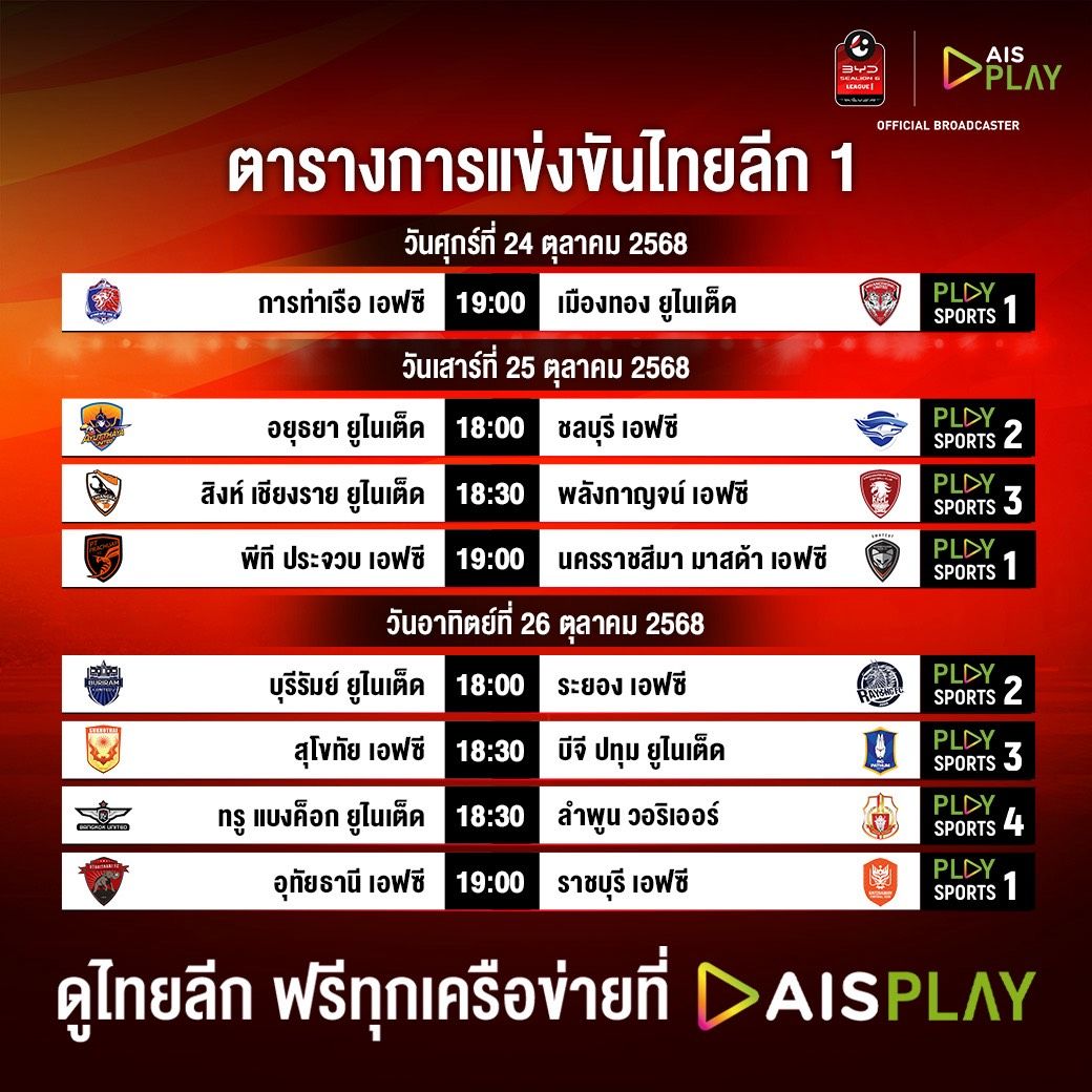 สัปดาห์นี้ลงทำการแข่งขันครบ 8 คู่ 8 สนาม ไฮไลท์สำคัญคือศึกบิ๊กแมตช์ระหว่าง "สิงห์เจ้าท่า" การท่าเรือ เอฟซี ที่ช่วงหลังทำผลงานได้อย่างยอดเยี่ยม มีคิวเปิดรังแพท สเตเดียม รับการมาเยือนของ "กิเลนผยอง" เมืองทอง ยูไนเต็ด ซึ่งจะฟาดแข้งกันในวันศุกร์ที่ 24 ตุลาคม 2568 เวลา 19.00 น. AIS PLAY SPORTS1 ยิงสด