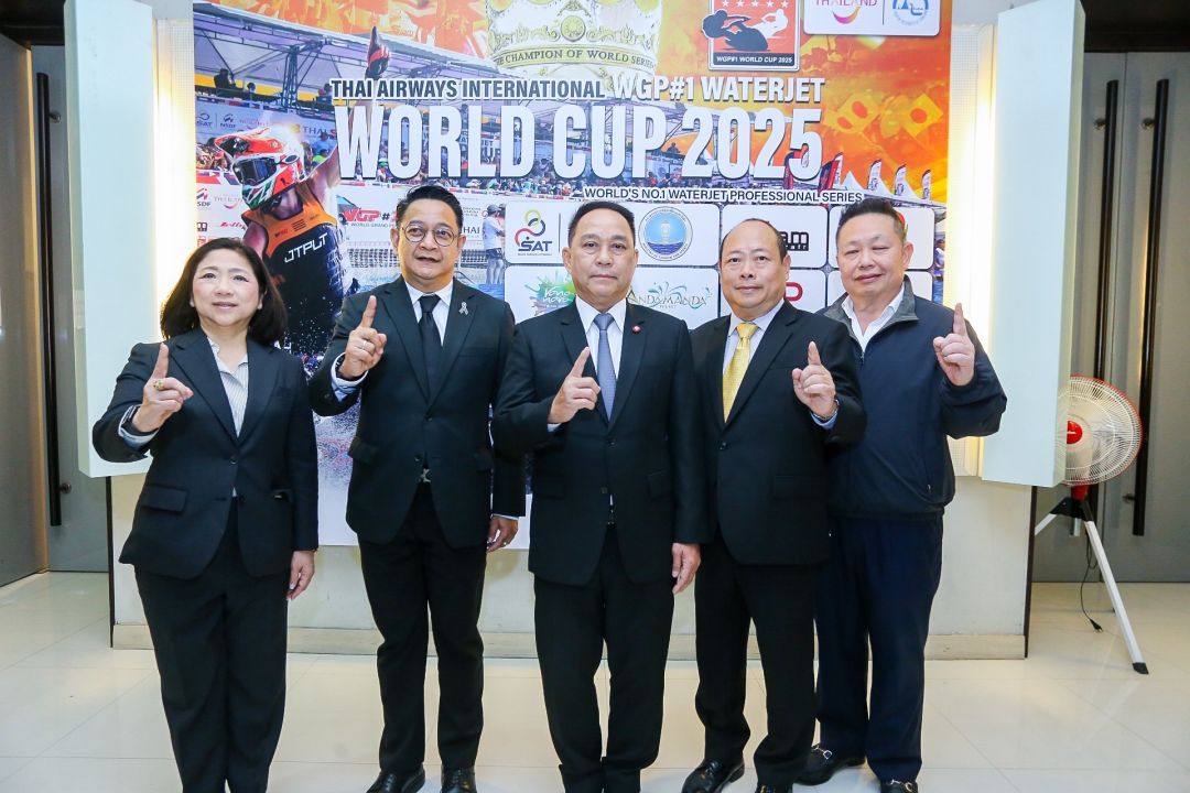 พล.ต.อ.เดชณรงค์ สุทธิชาญบัญชา นายกสมาคมกีฬาเจ็ตสกีแห่งประเทศไทยฯ พร้อมด้วย ดร.ชลันดา ชอบจิตร ผู้อำนวยการกองบริหารงานและประเมินผลกีฬาอาชีพ, ดร.สุวรรณา ศิลปะอาชา รองประธานคณะกรรมการโอลิมปิคแห่งประเทศไทย, นายทวีเดช ทองอ่อน ผู้อำนวยการฝ่ายกิจกรรม การท่องเที่ยวแห่งประเทศไทย และ นายวิโรจน์ จงกลวานิชสุข รองอธิบดีกรมทรัพย์สินทางปัญญา แถลงข่าวทัวร์นาเมนท์ WGP#1 การบินไทยเจ็ตสกีเวิลด์คัพ ที่การกีฬาแห่งประเทศไทย