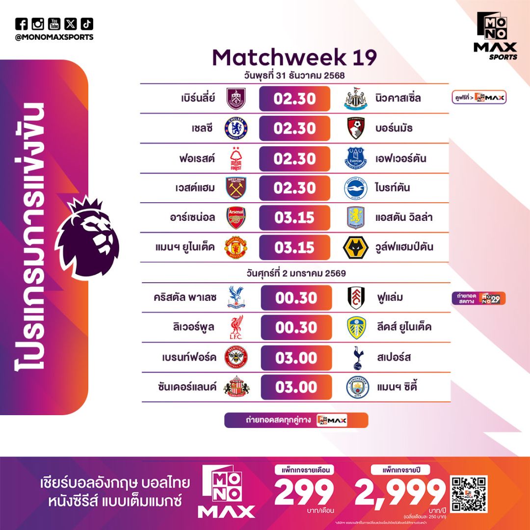 เปิดฉากคืนวันพุธที่ 31 ธันวาคม 2568 ส่งท้ายปีด้วยโปรแกรมพร้อมกันถึง 6 คู่ ตั้งแต่ เวลา 02.30 น. (คืนวันอังคารที่ 30 ธันวาคม 2568) ถ่ายทอดสดทาง Monomax โดย เบิร์นลีย์ เปิดบ้านรับมือ นิวคาสเซิล ยูไนเต็ด เกมสำคัญของทีมที่ต้องการแต้มเพื่อขยับอันดับ ขณะที่ เชลซี เจองานไม่ง่ายเมื่อดวล บอร์นมัธ ที่ฟอร์มกระเตื้องต่อเนื่อง อีกคู่ที่น่าจับตาคือ น็อตติงแฮม ฟอเรสต์ พบ เอฟเวอร์ตัน สองทีมที่ต้องการชัยชนะเพื่อหนีโซนล่างของตาราง รวมถึง เวสต์แฮม ยูไนเต็ด พบ ไบรท์ตัน เกมวัดแท็กติกของสองกุนซือสายบอลบุก และ เวลา 03.15 น. แฟนบอลห้ามพลาด อาร์เซนอล พบ แอสตัน วิลลา เกมสำคัญของทีมรั้งอันดับหัวตาราง ก่อนปิดท้ายคืนด้วย แมนเชสเตอร์ ยูไนเต็ด พบ วูล์ฟแฮมป์ตัน ที่ “ปีศาจแดง” ต้องการสามแต้มเพื่อเรียกความมั่นใจ