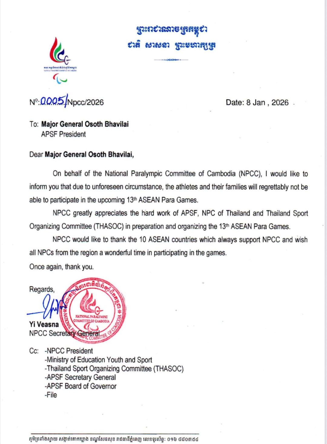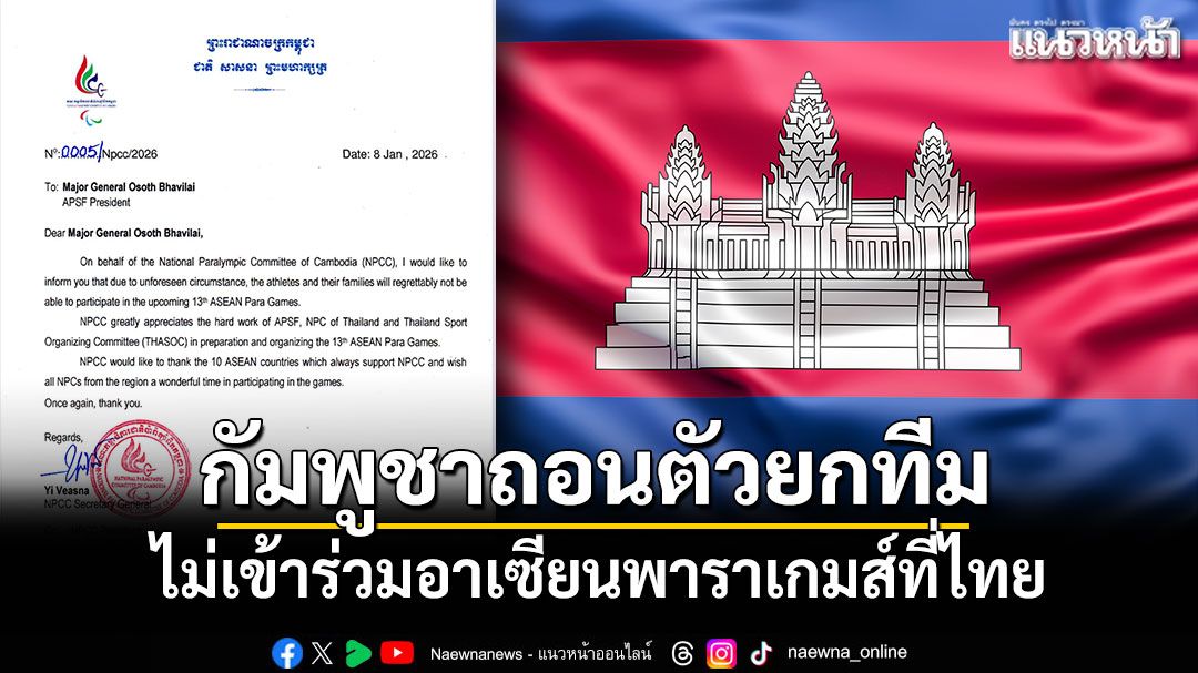 13 มกราคม 2569 คณะกรรมการพาราลิมปิกแห่งชาติกัมพูชา (NPCC) ได้ออกแถลงการณ์ ประกาศถอนตัวนักกีฬาทั้งหมดออกจากการแข่งขันกีฬาอาเซียนพาราเกมส์ ครั้งที่ 13 ที่กำลังจะเปิดฉากขึ้นในประเทศไทย โดยหนังสือแจ้งการถอนตัวดังกล่าวถูกส่งตรงถึง พลตรี โอสถ ภาวิไล ประธานสหพันธ์กีฬาคนพิการแห่งอาเซียน (APSF) เป็นที่เรียบร้อยแล้ว