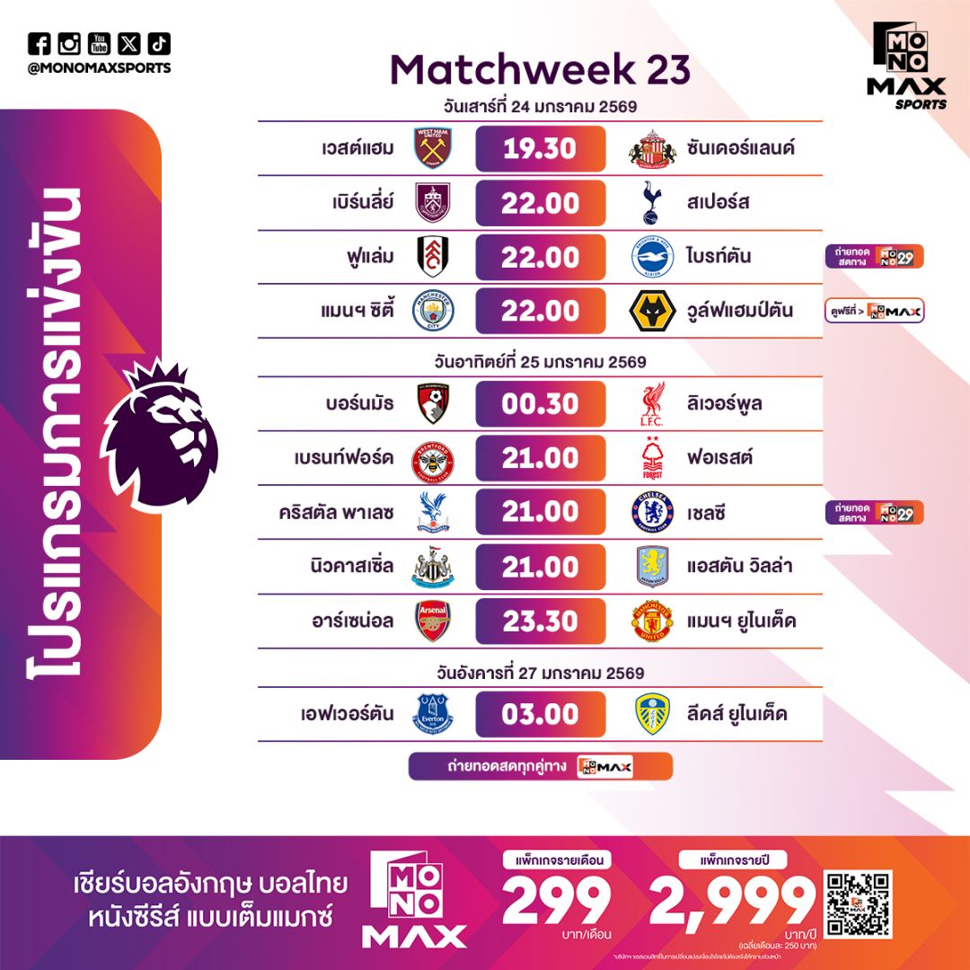 กับโปรแกรมสามคู่ที่เตะพร้อมกัน เริ่มจาก เบิร์นลีย์ พบ ท็อตแนม ฮ็อตสเปอร์ “ไก่เดือยทอง” ต้องเน้นชัยชนะเพื่อขยับอันดับ ต่อด้วยเกมเปิดแลกของ ฟูแลม พบ ไบรท์ตัน แอนด์ โฮฟ อัลเบียน สองทีมเกมรุกจัดจ้านที่พร้อมสร้างสีสันตลอด 90 นาที โดยคู่นี้ถ่ายทอดสดทั้ง Monomax และ ช่อง MONO29 ก่อนปิดท้ายค่ำคืนด้วยอีกหนึ่งคู่เด่น เมื่อ “เรือใบสีฟ้า” เปิดบ้านล่าแต้มสำคัญ แมนเชสเตอร์ ซิตี้ พบ วูล์ฟแฮมป์ตัน วันเดอเรอร์ส และคู่ดึก เวลา 00.30 น. วันอาทิตย์ที่ 25 มกราคม 2569 (คืนวันเสาร์ที่ 24 มกราคม 2569) แฟนบอลยังได้ลุ้นต่อเนื่องกับเกม บอร์นมัธ พบ ลิเวอร์พูล เมื่อหงส์แดงบุกเยือนด้วยเป้าหมายสามแต้มเต็ม รับชมทาง Monomax