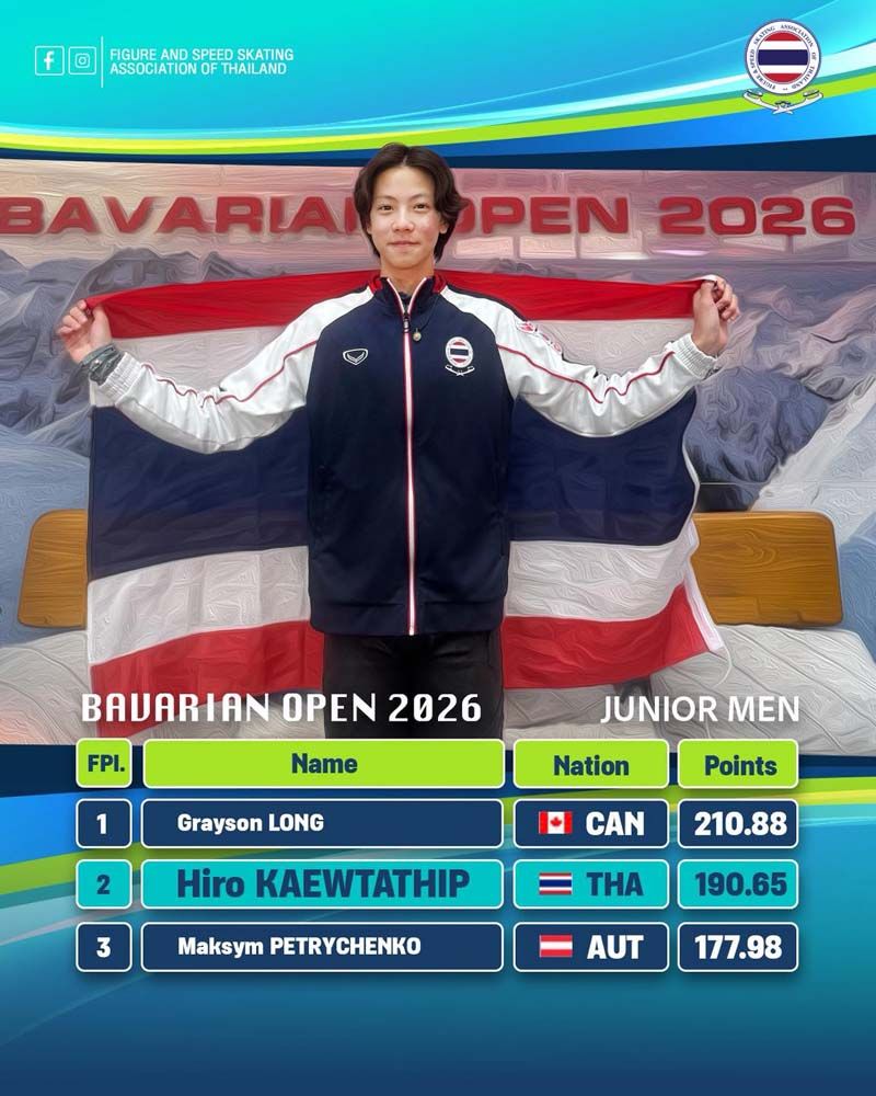 "ฮิโระ แก้วตาทิพย์" นักกีฬาฟิกเกอร์สเก็ตติ้งทีมชาติไทย คว้าอันดับที่ 2 เหรียญเงิน ในรายการ Bavarian Open 2026 ณ ประเทศเยอรมนี