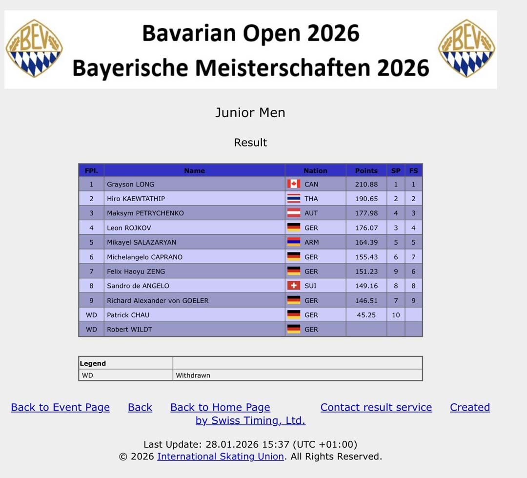 * ฮิโระ แก้วตาทิพย์ นักฟิกเกอร์สเก็ตติงไทยลงแข่งในรายการ บาวาเรียน โอเพ่น 2026 พร้อมกับคว้าอันดับที่สองมาได้สำเร็จ