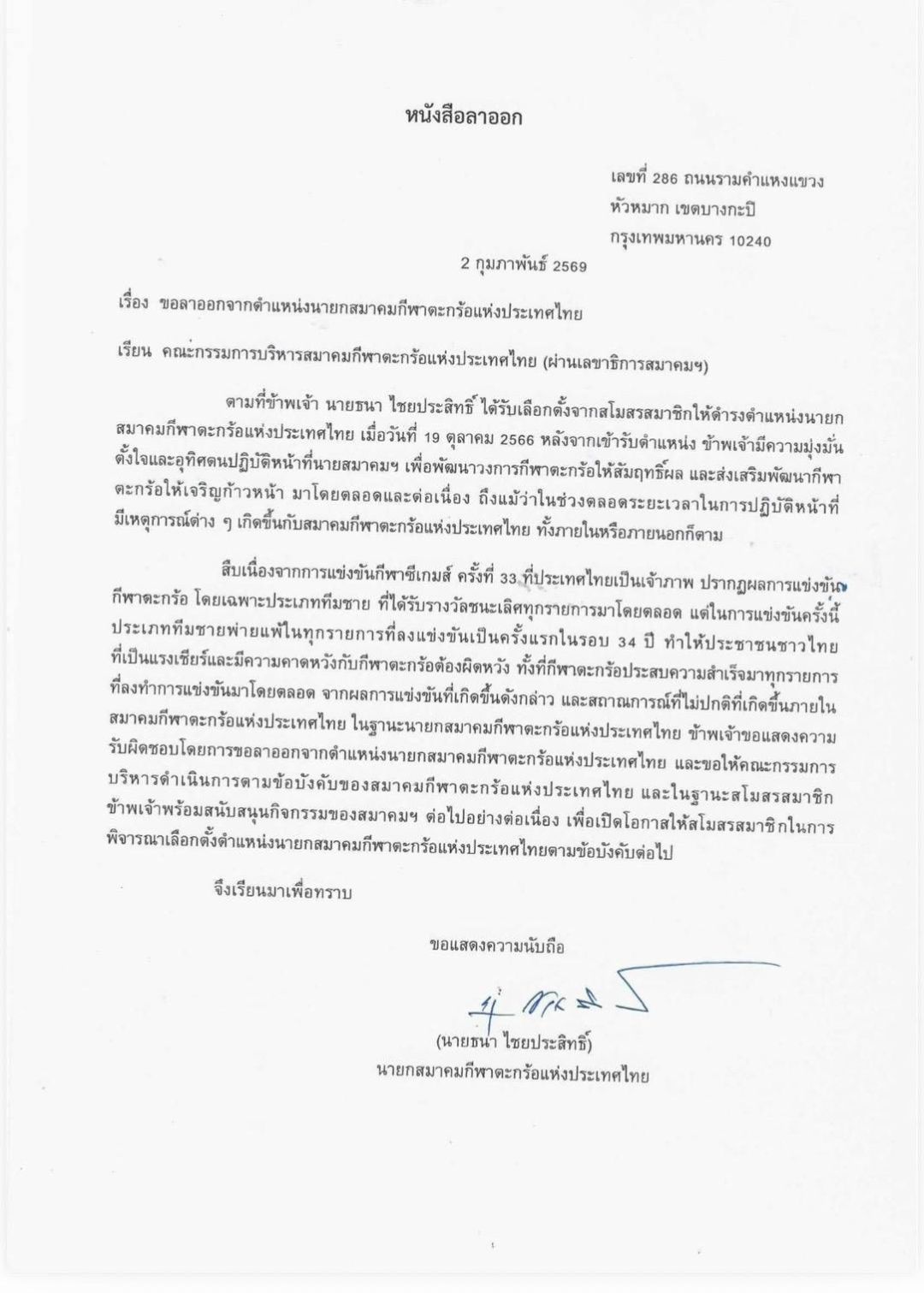 ในหนังสือลาออก ระบุว่า หลังจากเข้ารับตำแหน่งนายกสมาคมฯ ตนได้ปฏิบัติหน้าที่ด้วยความมุ่งมั่น ตั้งใจ และอุทิศตนเพื่อพัฒนาวงการกีฬาตะกร้ออย่างเต็มกำลัง แม้ตลอดช่วงเวลาที่ดำรงตำแหน่ง จะมีเหตุการณ์และปัญหาทั้งภายในและภายนอกสมาคมเกิดขึ้นอย่างต่อเนื่องก็ตาม