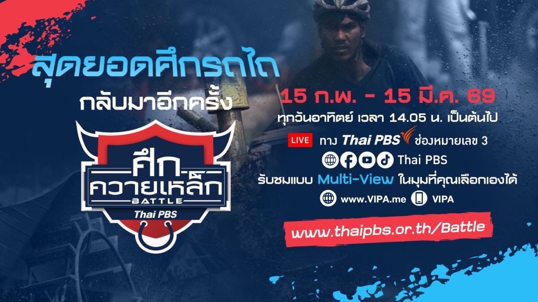 ไทยพีบีเอส ร่วมสร้างประสบการณ์รับชมในมุมมองใหม่ ! ด้วยการถ่ายทอดสดการแข่งขัน “ศึกควายเหล็ก Battle ประจำปี 2569” ในรูปแบบ LIVE Multi-View ที่คุณผู้ชมเลือกมุมที่อยากดูได้เอง ทาง www.VIPA.me กับ 5 สนามแข่ง ทุกวันอาทิตย์ เวลา 14.05 – 16.00 น. ตั้งแต่เวลา 14.05 น. เป็นต้นไป ทางไทยพีบีเอส ทุกช่องทาง