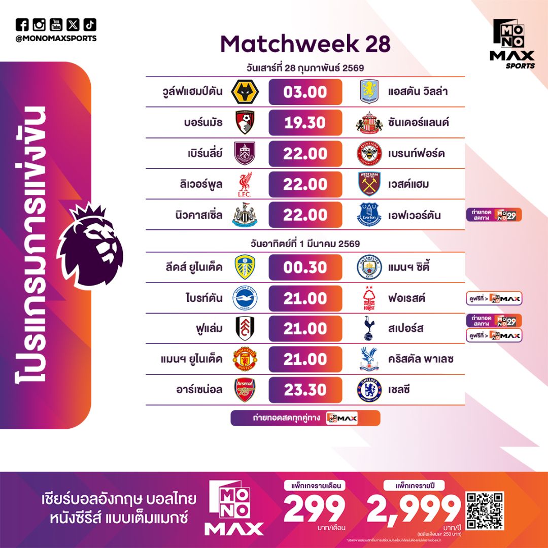 ศึกฟุตบอลพรีเมียร์ลีก อังกฤษ สุดสัปดาห์ปลายเดือนกุมภาพันธ์ต่อเนื่องต้นมีนาคม เข้าสู่ช่วงโค้งสำคัญที่ทุกคะแนนมีความหมาย โดยเฉพาะลอนดอนดาร์บี้ อาร์เซนอล พบ เชลซี ที่ถูกยกให้เป็นบิ๊กแมตช์ประจำสัปดาห์ พร้อมแรงสั่นสะเทือนต่อพื้นที่ท็อปโฟร์ ขณะเดียวกันหลายสนามยังเกี่ยวพันทั้งการลุ้นแชมป์และหนีตกชั้น ทำให้โปรแกรมระหว่างวันเสาร์ที่ 28 กุมภาพันธ์ 2569 ถึงวันอาทิตย์ที่ 1 มีนาคม 2569 เต็มไปด้วยความเข้มข้นตลอดสองวัน ถ่ายทอดสดครบทุกคู่ทาง Monomax และบางคู่รับชมได้ทาง ช่อง MONO29