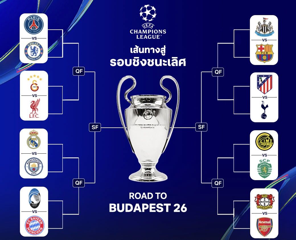 ผลปรากฏว่ามี 2 บิ๊กแมตช์ใหญ่เกิดขึ้นเมื่อ "เปแอสเช" ปารีส แซงต์ แชร์กแมง แชมป์เก่า จะดวลกับ "สิงโตน้ำเงินคราม" เชลซี ขณะที่ "เรือใบสีฟ้า" แมนเชสเตอร์ ซิตี้ จะดวลโจทย์เก่าอย่าง "ราชันชุดขาว" เรอัล มาดริด