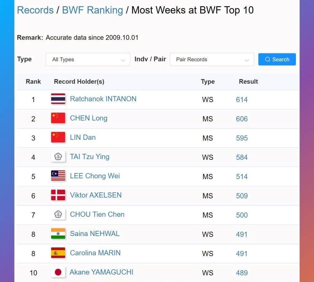 โดย รัชนก ได้โชว์ภาพจากเว็บไซต์ของสหพันธ์แบดมินตันนานาชาติ หรือ บีดับเบิลยูเอฟ ที่แสดงสถิติให้เห็นว่าเธออยู่ในอันดับ 1 ของผู้เล่นที่อยู่ในท็อป 10 ของโลกมากที่สุด ที่ 614 สัปดาห์ เหนือสองตำนานนักแบดมินตันชาวจีน ทั้ง เฉิน หลง และ หลิน ตัน ที่มีสถิติอยู่ที่ 606 และ 595 สัปดาห์ตามลำดับ