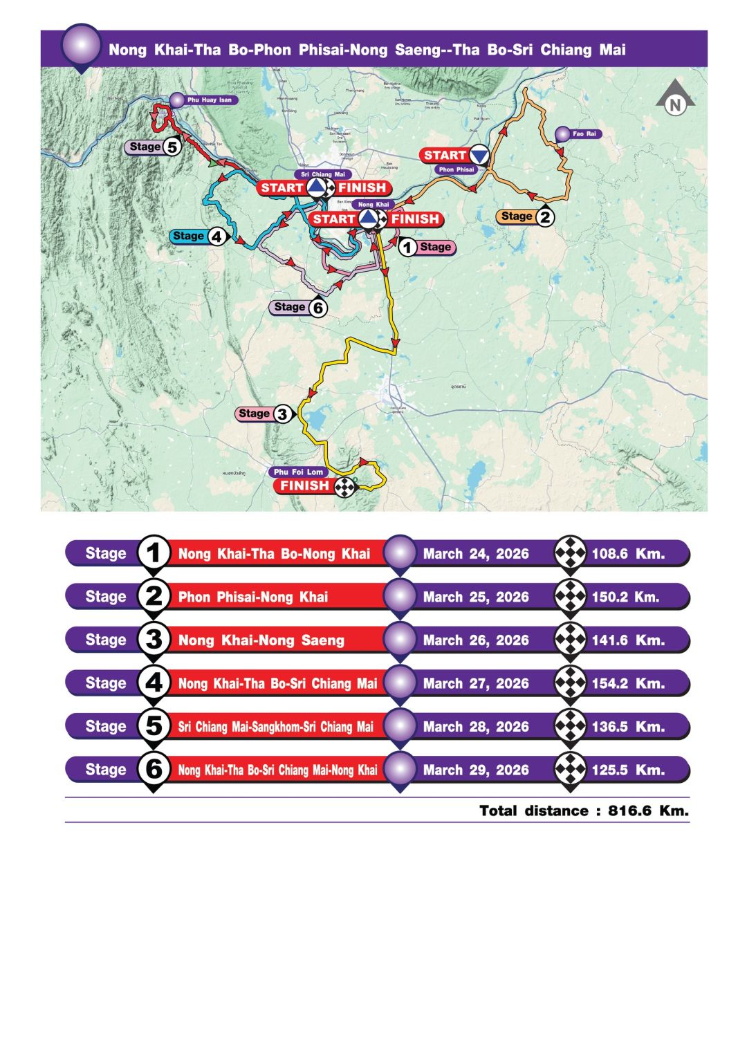 การแข่งขันแบ่งเป็น 2 ประเภท 1.ประเภททีมชาย (6 สเตจ) ระหว่างวันที่ 24 – 29 มีนาคม 2569 เส้นทางจังหวัดหนองคาย – ท่าบ่อ – โพนพิสัย และ 2.ประเภททีมหญิง (3 สเตจ) วันที่ 31 มีนาคม – 2 เมษายน 2569 เส้นทางจังหวัดหนองคาย