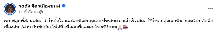 ทางด้าน รถถัง จิตรเมืองนนท์ ได้โพสต์ภาพสุดอบอุ่นคู่กับเสี่ยสมจิตร พร้อมข้อความระบุว่า "เพราะลูกพี่สอนเสมอว่าให้ตั้งใจ และลูกพี่จะรอดูเอง... ขอบคุณลูกพี่นายสมจิตรที่อัดฉีดเบื้องต้น 2 ล้านกับชัยชนะไฟต์นี้ ผมจะทำเพื่อลูกพี่และคนไทยที่รักผมครับ"