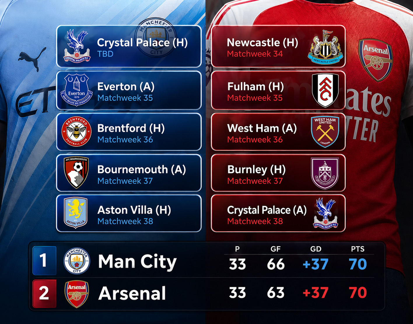 ทั้งนี้หากว่า แมนฯ ซิตี้ และอาร์เซนอล ชนะเกมที่เหลืออีก 5 นัดทั้งหมด พวกเขาจะจบฤดูกาลด้วยคะแนน 85 แต้มเท่ากัน ซึ่งหมายความว่าผลต่างประตูหรือจำนวนประตูที่ทำได้ คือสิ่งที่ต้องจับตา